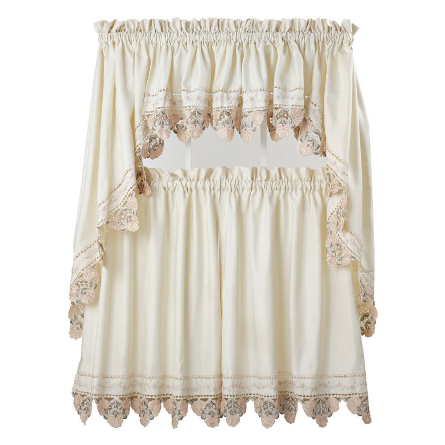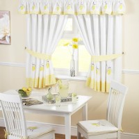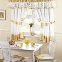 - The curtain from an unusual fabric with convex volumetric elements that attract the eye looks exclusive. Such an accessory will play a distracting role and decorate a modest kitchen interior devoid of luxury and intricacy.