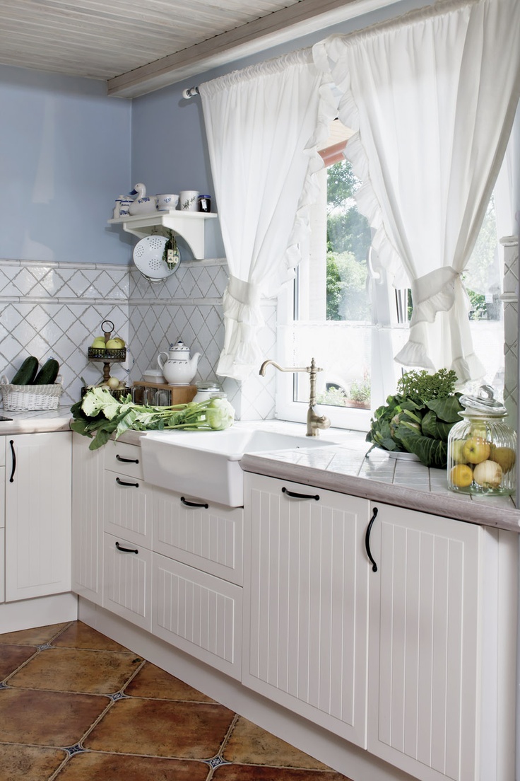 Provence curtains are made of natural fabrics: linen, chintz, cotton, lace, frills, embroidery are used as decorations. The color scheme of the style is sustained in muted, as if faded in the bright sun tones. This is a palette of marine and natural subjects: shades of orange, olives, greens, turquoise, lavender, sunny and sand tones.