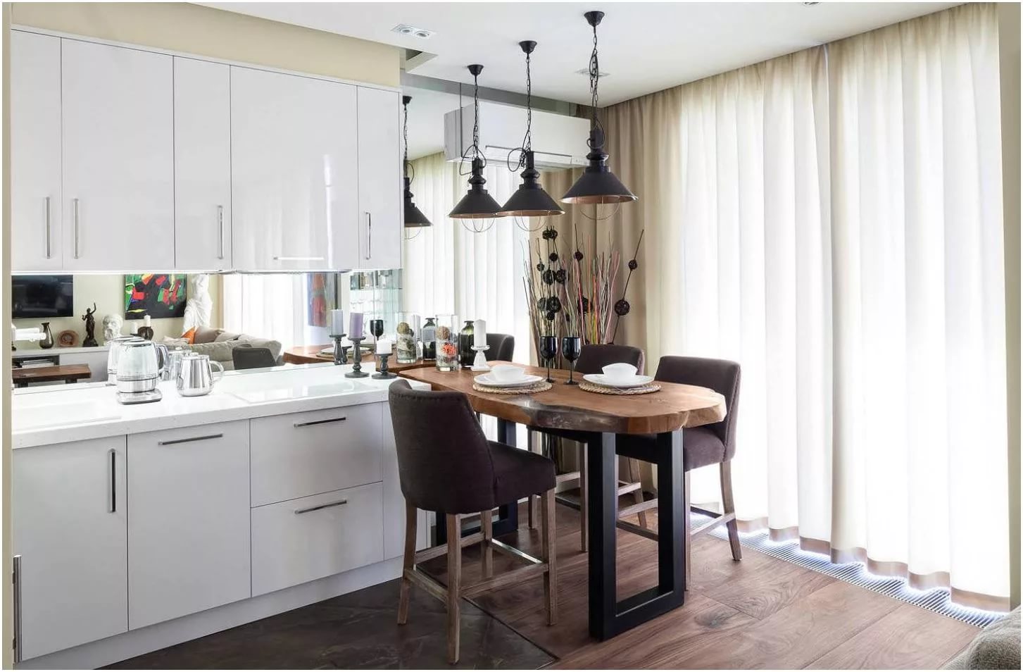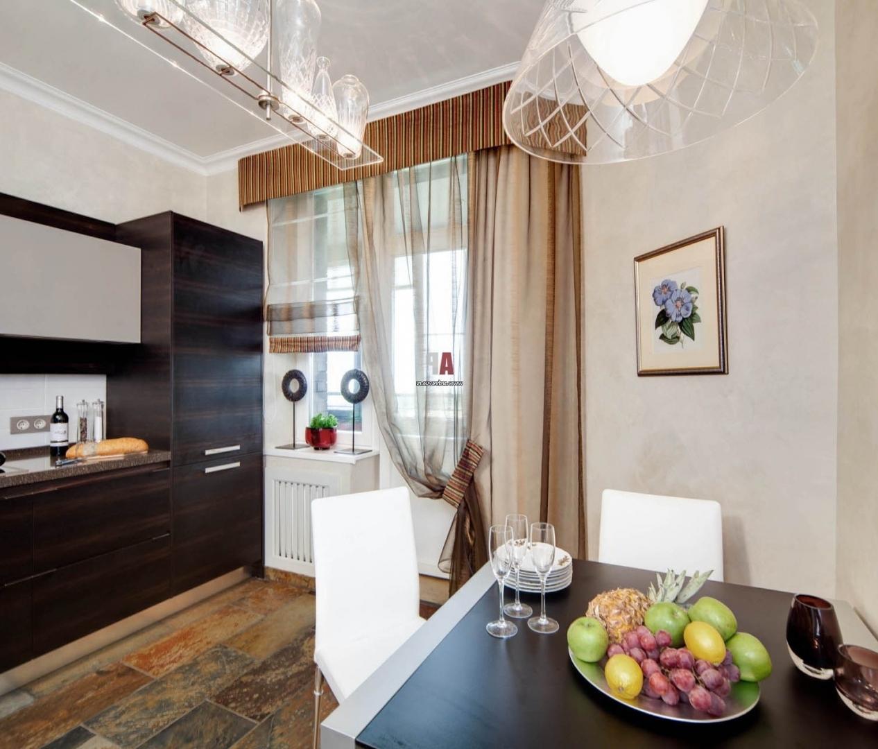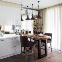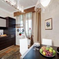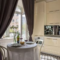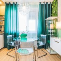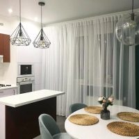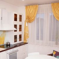 Recently, studio apartments have become very popular. For example, in the living room, curtains can be made ceremonial, and in the kitchen simpler, because water droplets and grease cannot be avoided in any case. Designers allow the use of different styles of curtains, but the color scheme should be used alone. You can use the same material for decoration in the kitchen.