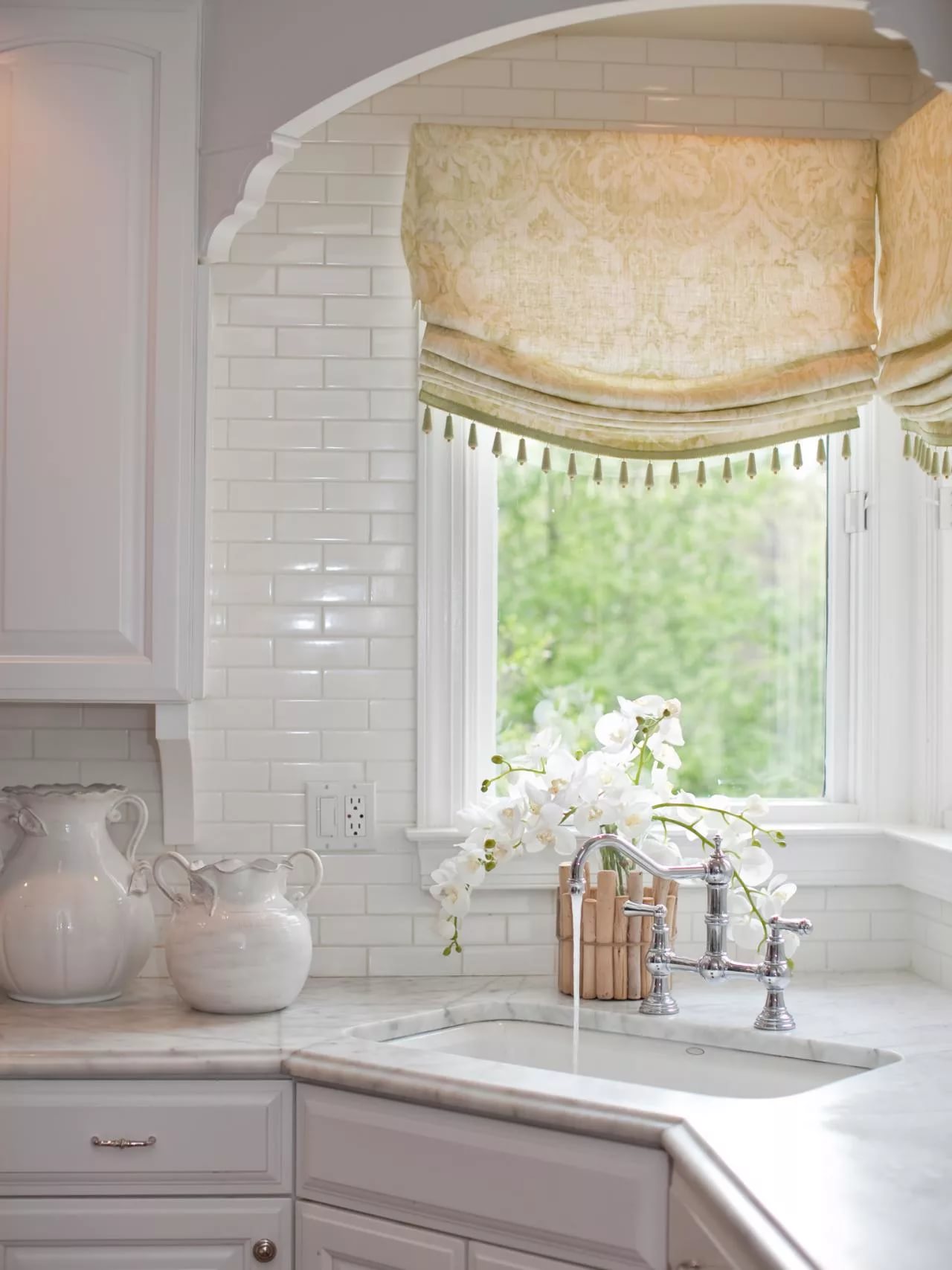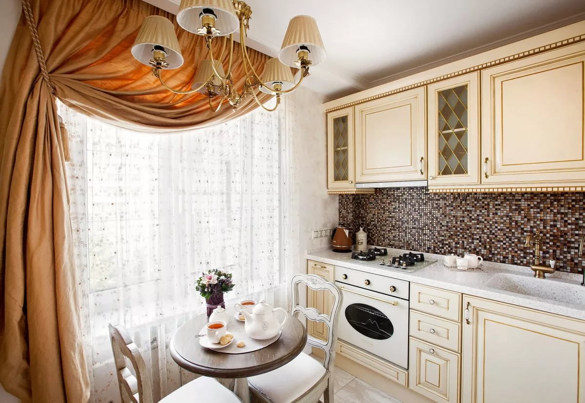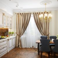 Cascading curtains in the kitchen in a classic style