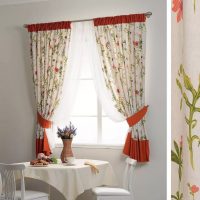 It is recommended to use light shades for a small room; for a kitchen in a rustic style, you can use curtains with small ornaments. To make the room visually higher, you can use a vertical strip, and to wider - horizontal. If the kitchen is connected to the living room, then you can use bright colors or a large print, which is strictly not recommended in a small room.