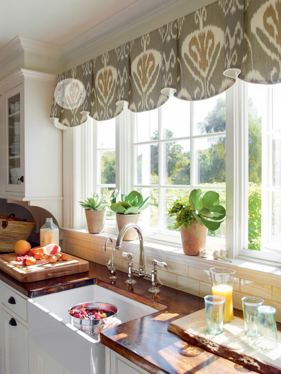 Functionality requires short curtains that will not take up space and interfere with moving around the kitchen.