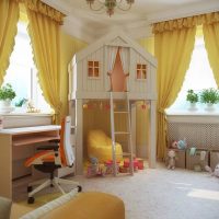 As in the bedroom, it is important to provide the baby with the opportunity to sleep in daylight. If the child is small, and he needs a day's sleep, then it is advisable to choose a dense tissue. However, many people like to create fabulous, magical designs in children's rooms, so light, flying fabrics, preferably pastel colors, are suitable.