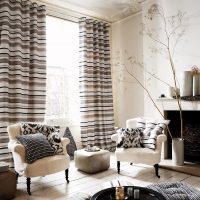 If the room has high ceilings, you will not want to make it even higher by hanging curtains with a vertical strip. But another thing, if the ceiling literally puts pressure on you, then this option will save the room. If the room is narrow, then horizontal stripes will visually expand it.