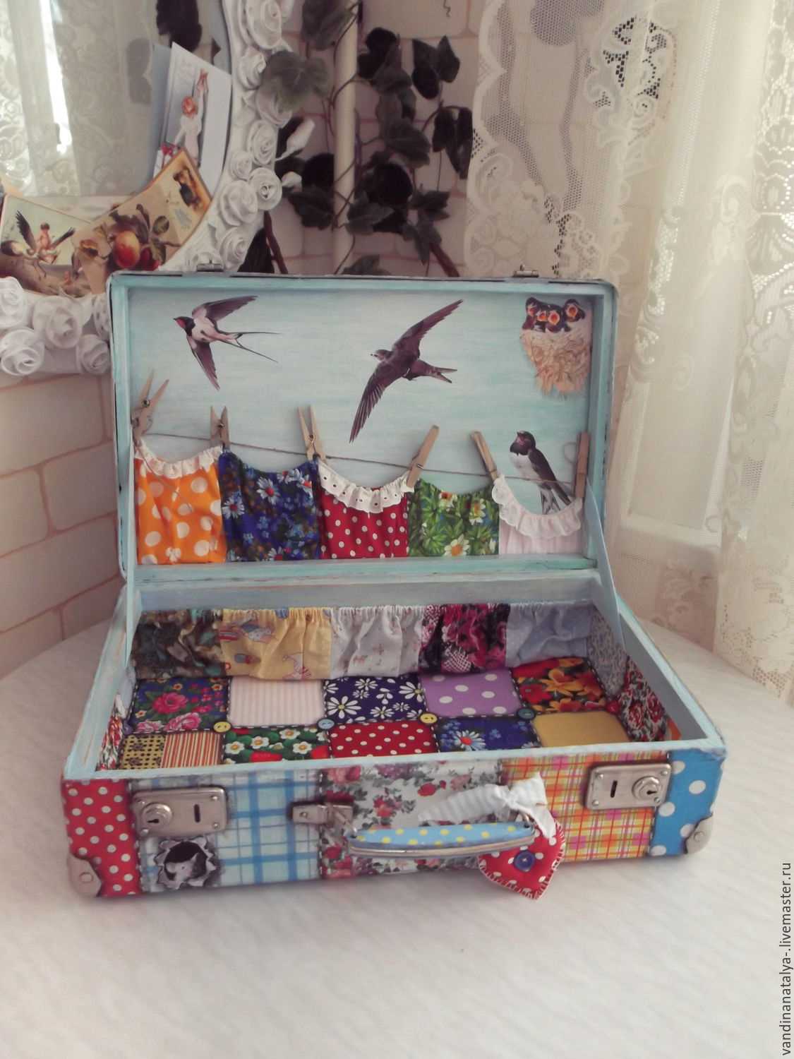 A large antique wardrobe can be equipped for storing things, using it as a small wardrobe or minibar, attached to the wall. To do this, you need to take a certain number of boards, equal in length to the width of the suitcase. They will serve as shelves that are installed inside the suitcase using special mounting angles. Next, you can carry out external decoration. If there are several large bags, you can make a composition in the form of a closet, where each of them will be a separate section. They are attached to each other, and their back is nailed to a chipboard sheet using a construction stapler or small nails.