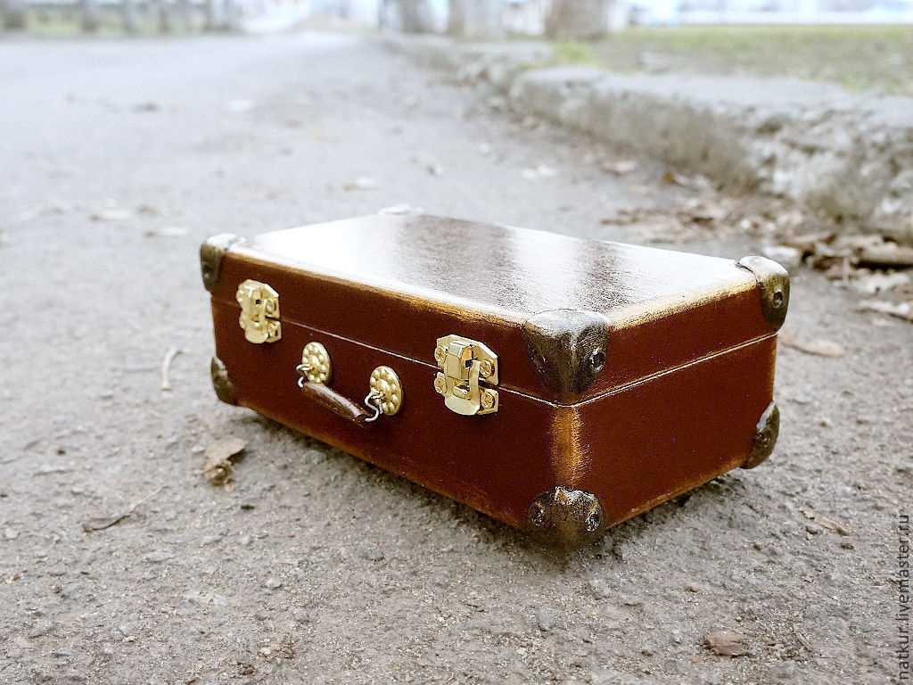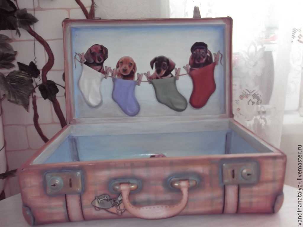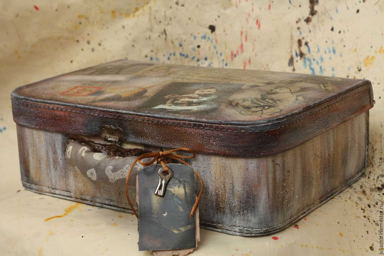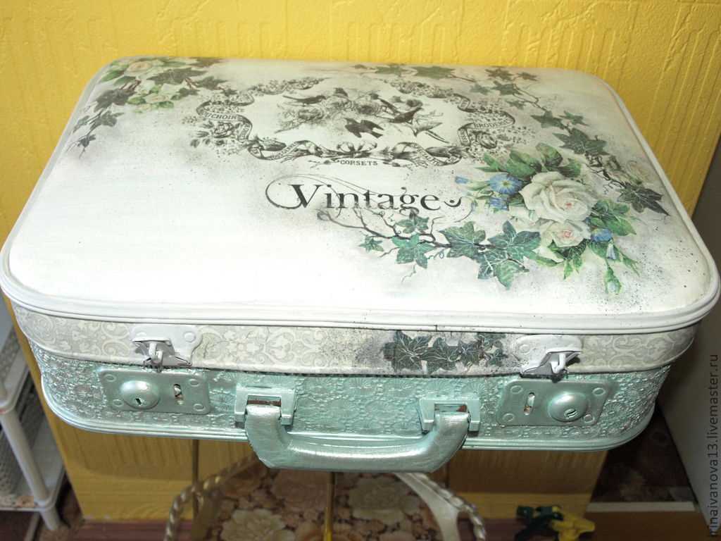 At the first stage, it is necessary to prepare the work surface. To do this, you need to clean the suitcase of dirt and dry it, glue the damaged areas and primed the surface. After that, smooth out irregularities with sandpaper. Then apply paint to the suitcase, creating the effect of scuffing or cracking.