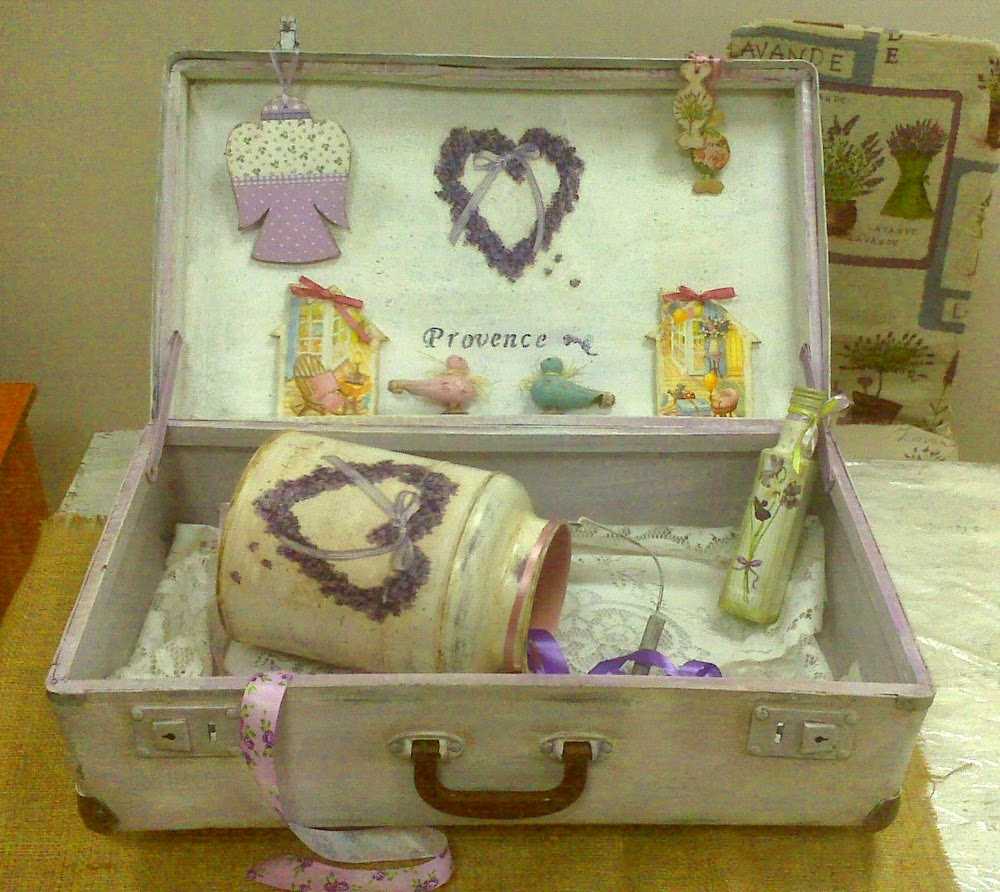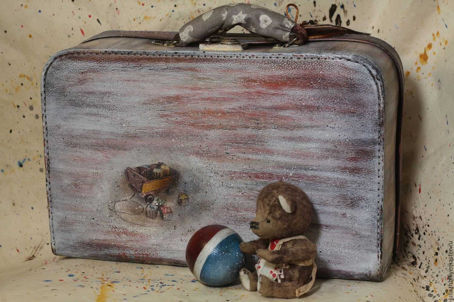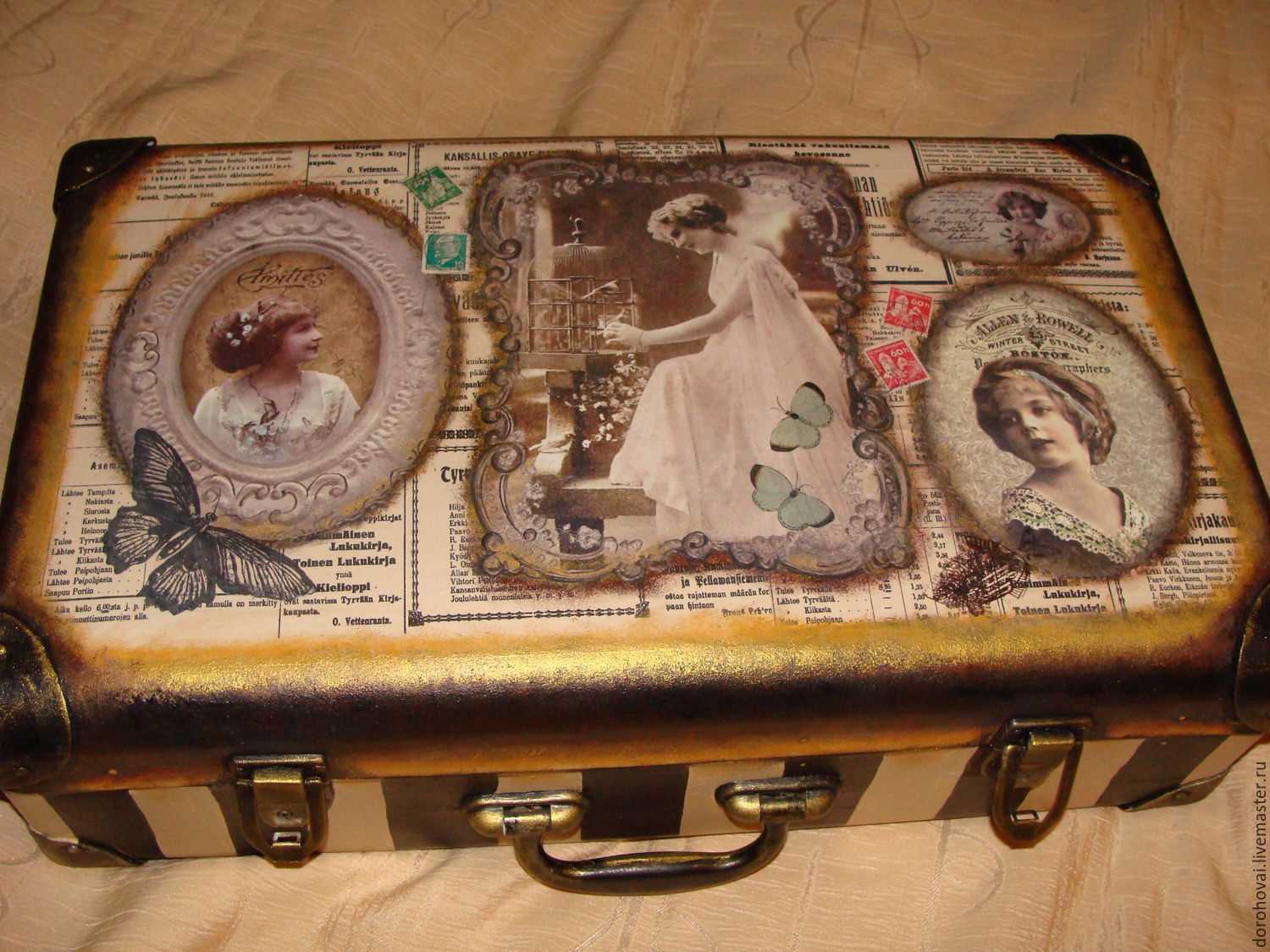 At the first stage, it is necessary to prepare the work surface. To do this, you need to clean the suitcase of dirt and dry it, glue the damaged areas and primed the surface. After that, smooth out irregularities with sandpaper. Then apply paint to the suitcase, creating the effect of scuffing or cracking.