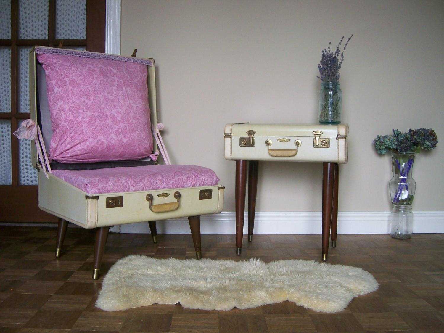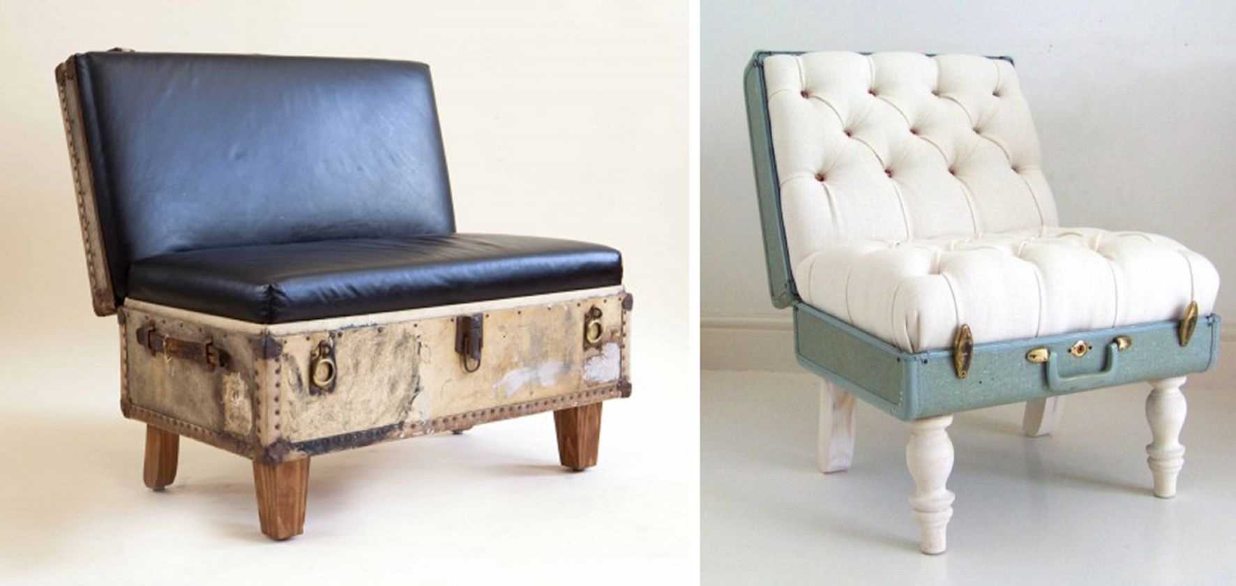 Another idea for the restoration of an old suitcase is the creation of upholstered furniture. A rigid frame for seating is fastened along the inner perimeter of the bag and is covered with upholstery material with soft filler. The same thing is done with the lid, so it acts as the back of a chair or sofa (depending on the size of the suitcase itself). Next, legs are attached to the product or placed on a frame.