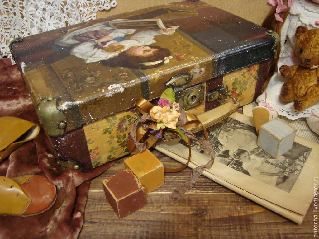 At the next stage, the selected drawing is placed on the prepared section of the old suitcase. To do this, apply glue to the image, and carefully attach it to the desired area. Using a roller, air is forced out from under the napkin. After drying, the entire surface of the suitcase is varnished.
