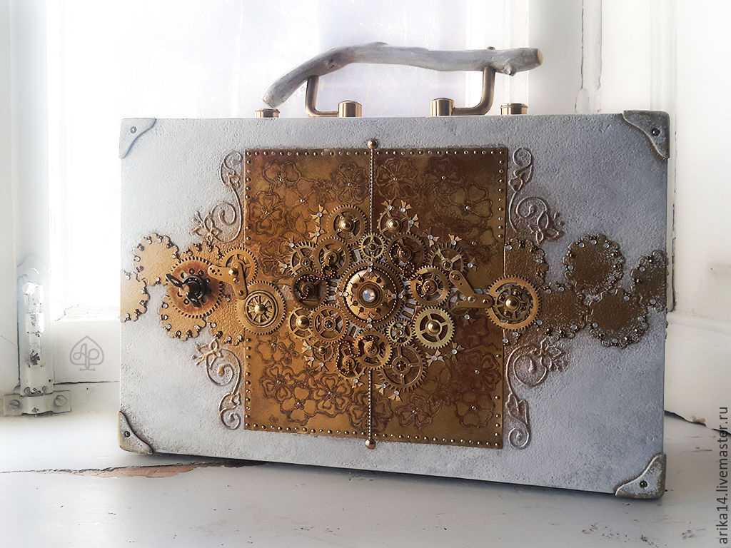 The decor of the suitcase in the unusual Point-to-Point technique consists in applying a picture consisting of colored dots-beads to its surface. The image is embossed and applied at the final stage of restoration before coating the product with varnish. At the initial stages, cleaning, priming and applying background paint to the surface of the suitcase takes place. Next, a sketch of the image is drawn with the drawing of all the details. The drawing itself is applied with acrylic paint and a contour in a special tube.