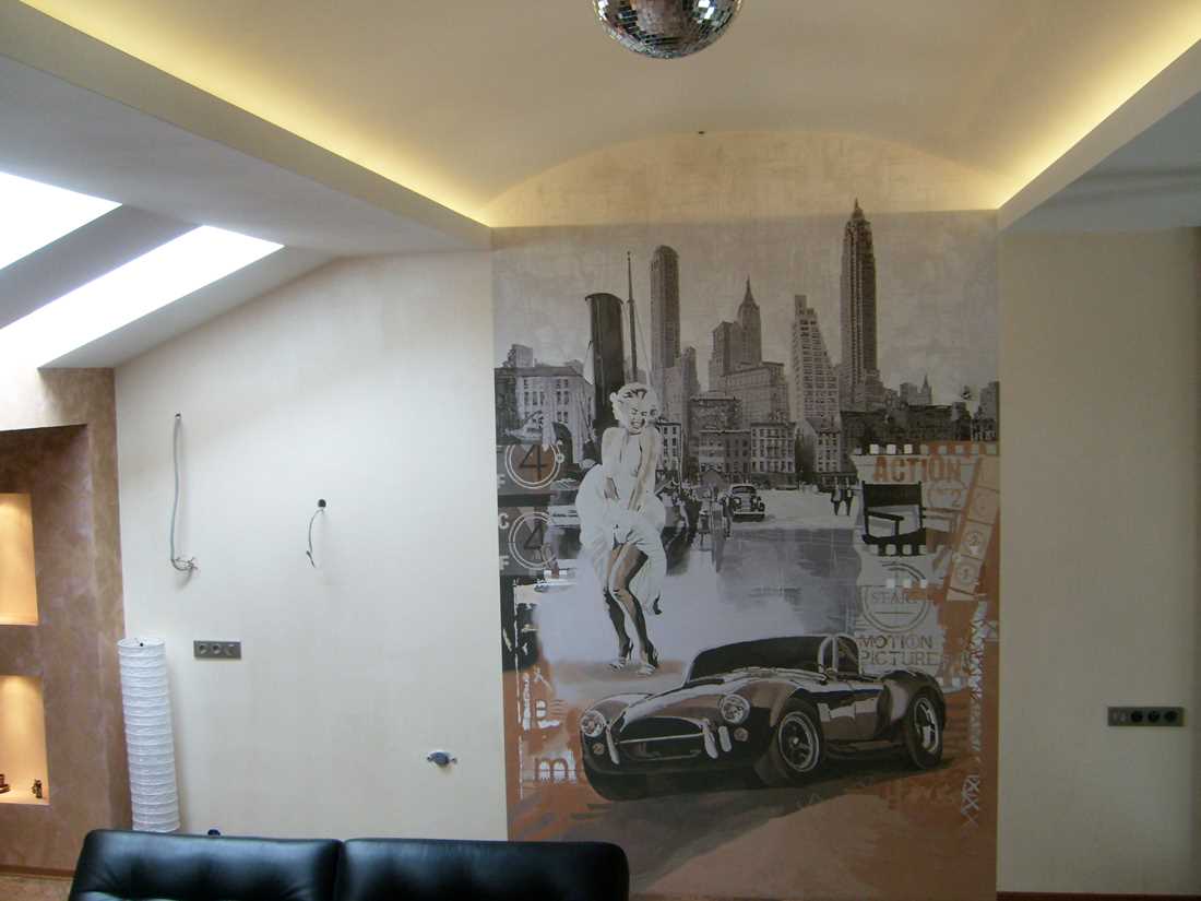 An important rule of painting walls in the interior is compliance with the measure. A saturation of the room with this kind of decor will turn a cozy corner into a museum of fine art. Another important nuance is the correct choice of pattern for decorating the apartment. So, for example, the image of cartoon characters will not look harmoniously in the living room, decorated in a classic style.