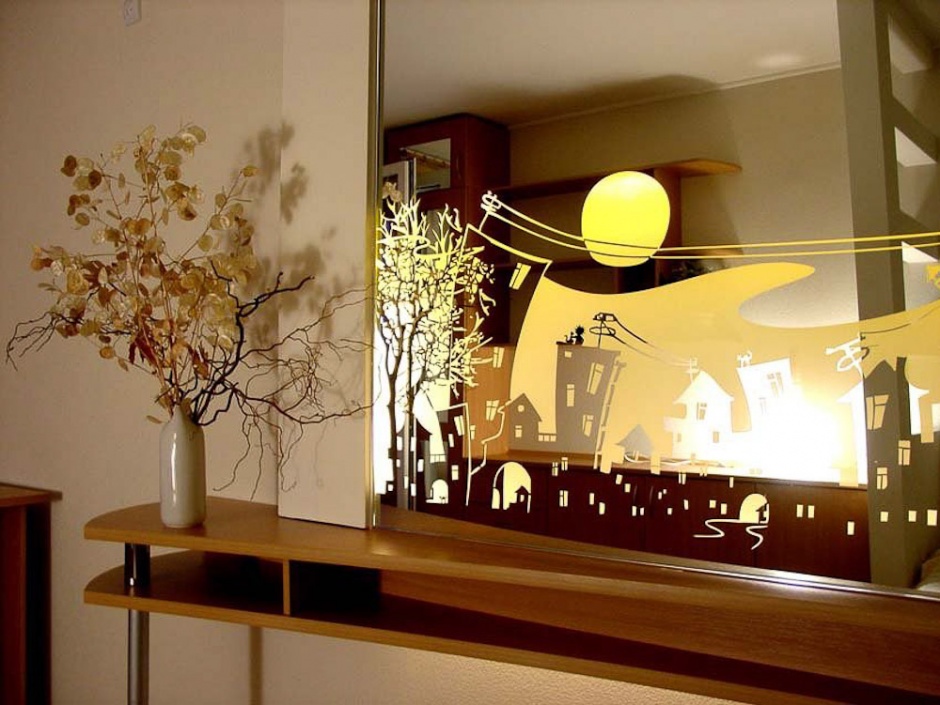 This option is suitable for those who love large models, but can not afford a mirror wall, floor or ceiling. Most often used sliding wardrobes with such a door. They can be installed in the bedroom, living room or hallway. An interesting effect will be created by similar floor tables or tables.