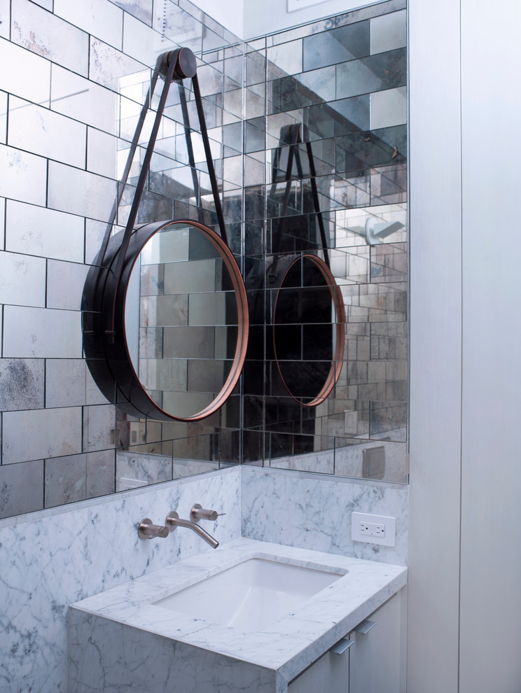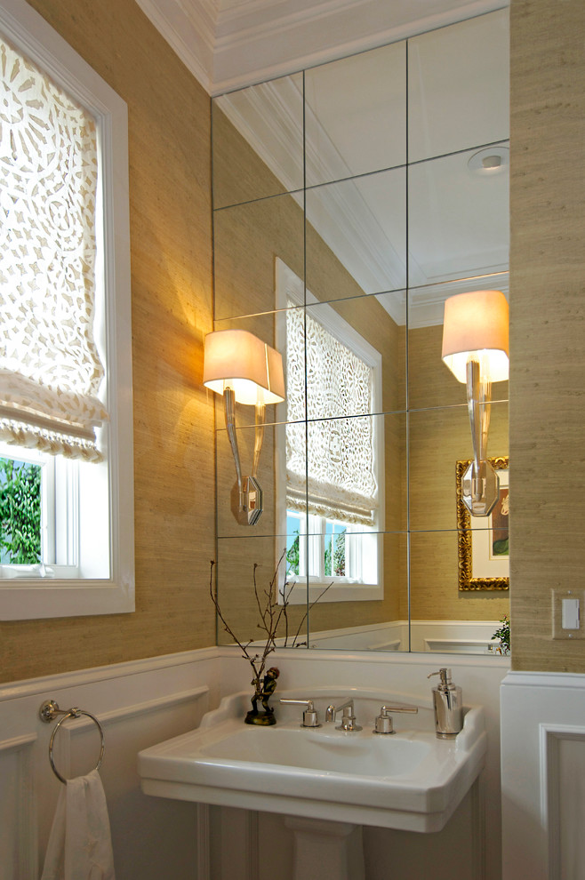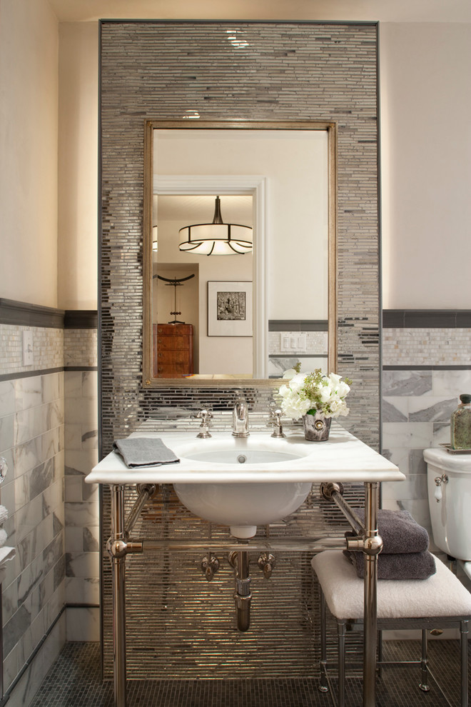 Mirror tiles in the interior can be placed on a small wall. Additionally decorated with molding. Then the solution looks complete.