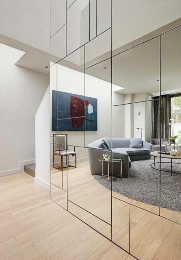 Mirror tiles in the interior are rarely used for floors. Using a similar technique, other reflective details in the design should be excluded.