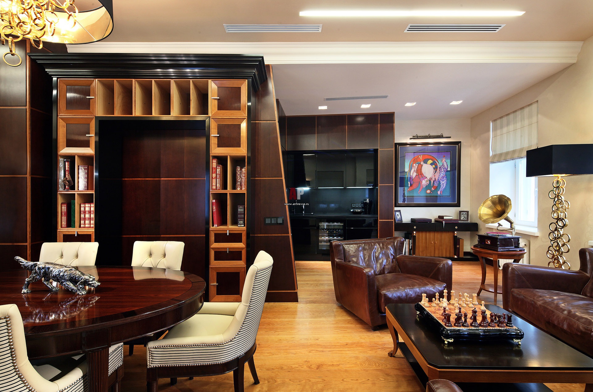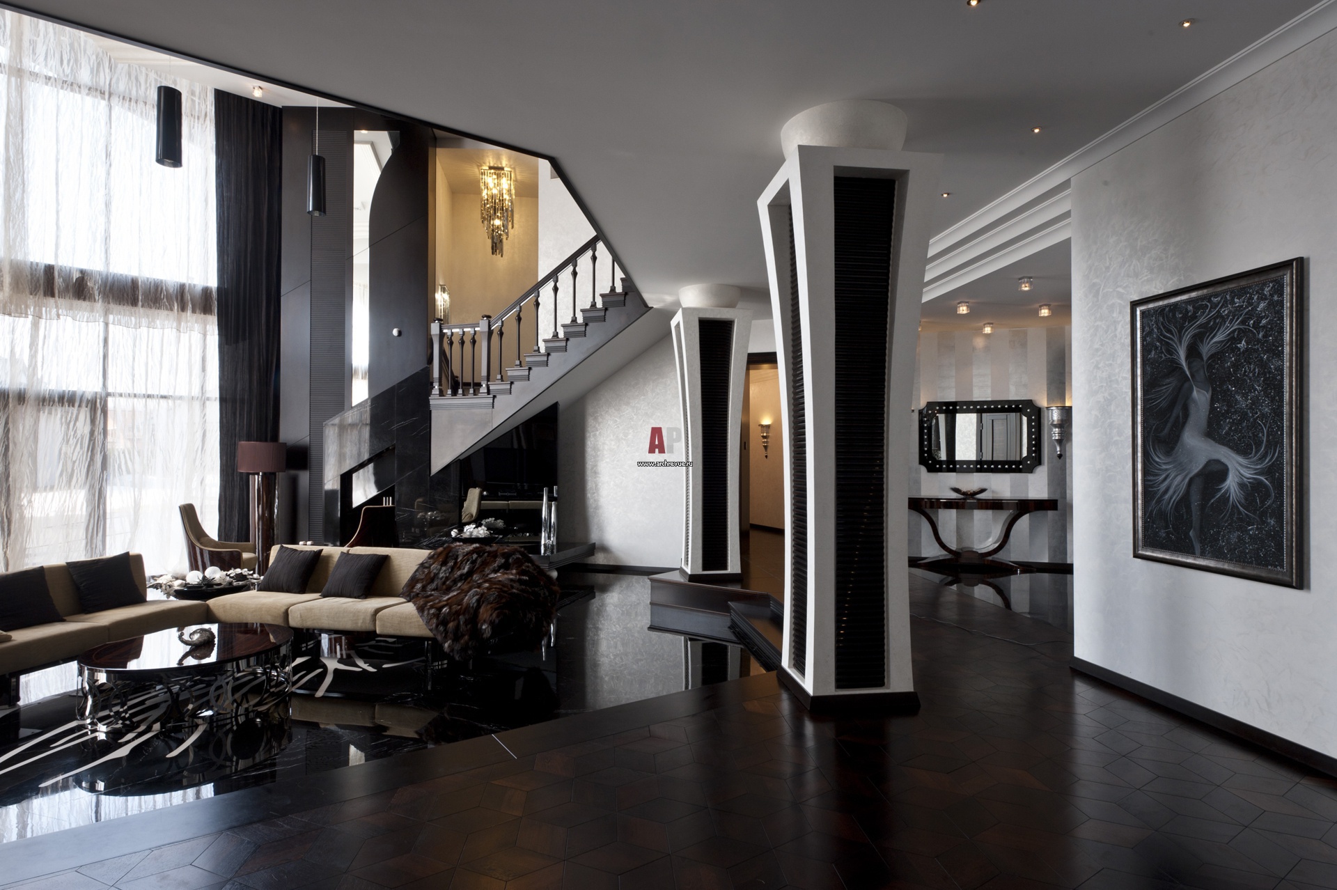The skin of a zebra on the floor, sculptures, vintage posters, mirrors, floor, table vases - all these details complement the interior in the art deco style - an interior that speaks of luxury, but does not shout about it, and therefore it looks harmonious and modern.