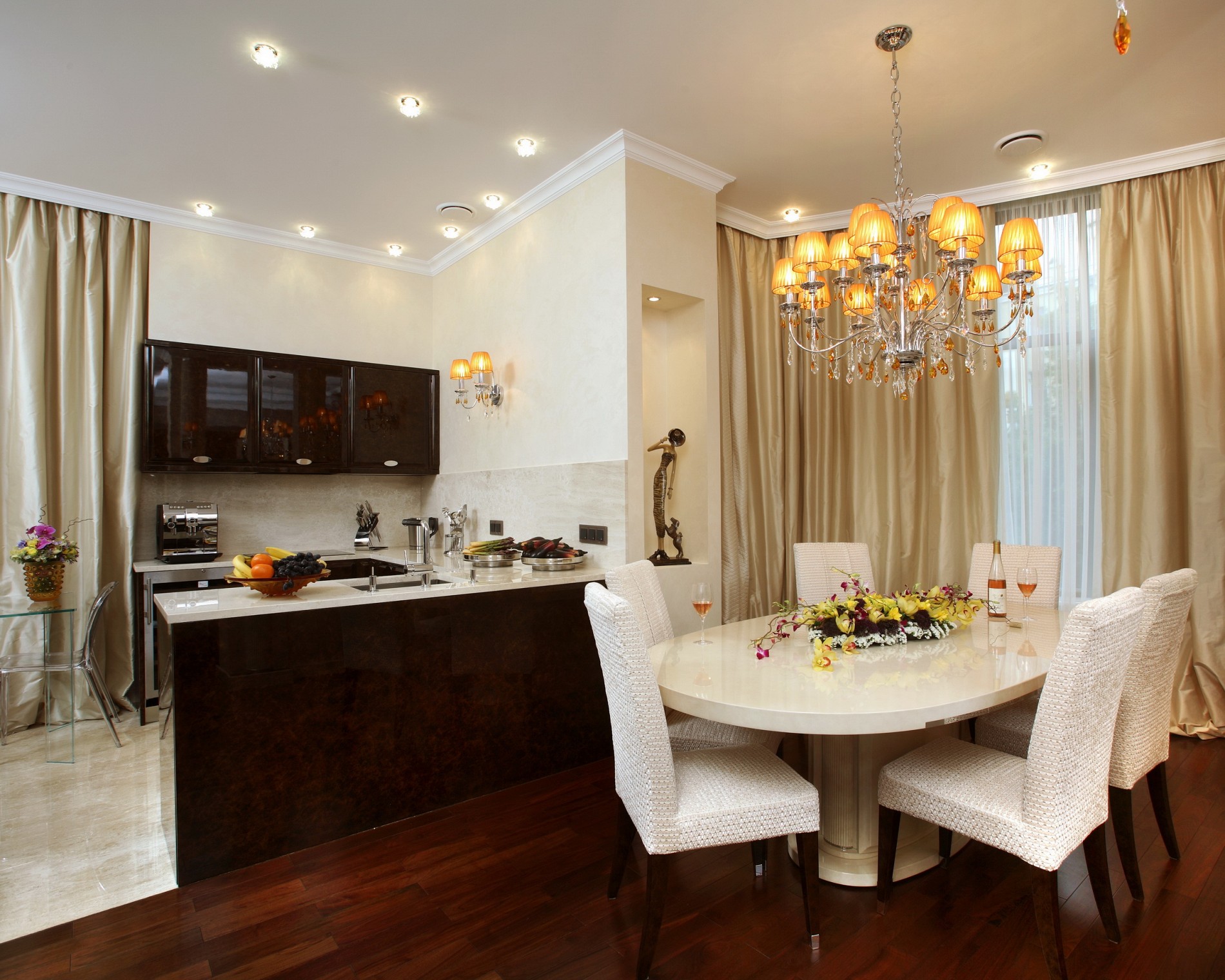 The interior should shine, amaze - hence the love of mirrors, polished natural surfaces. If a tension structure is chosen for the ceiling - only glossy, if the walls are finished with wallpaper - then only expensive, shiny, if the fabrics - then brocade, silk, satin, satin.