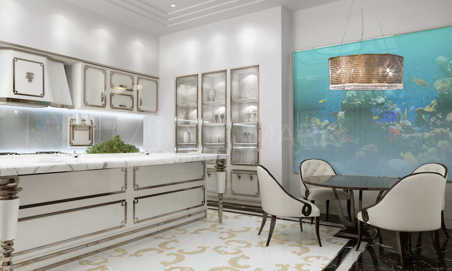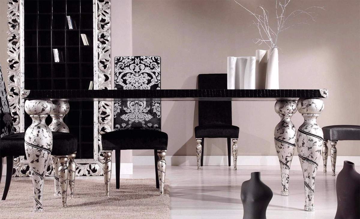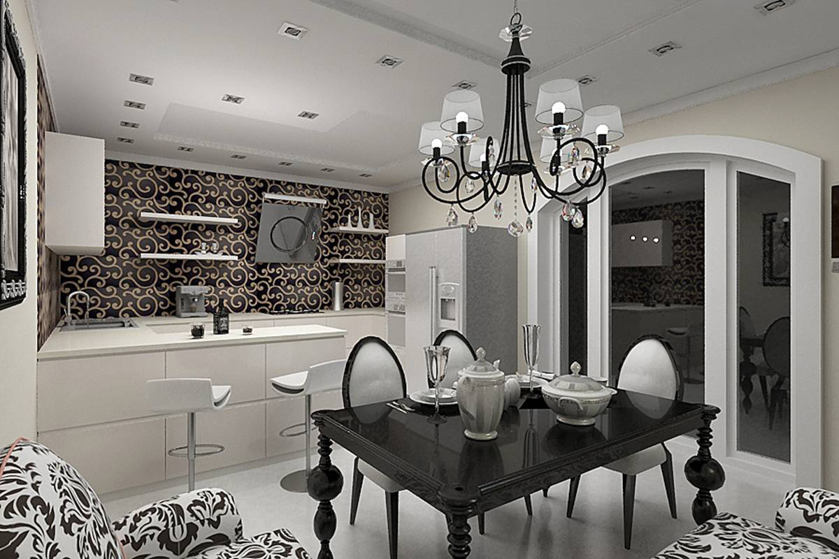 The furniture is light, luxurious and functional, it is convenient to use, despite the chic upholstery made of silk, velvet, natural fur or leather of exotic animals. In a spacious apartment, the dining area, regardless of layout, looks more like an elite restaurant than a common place to eat. It should be complemented by an elegant dining set with a large table and chairs with oval backs. The original decor will complement the luxury of general and local lighting, as in the photo.