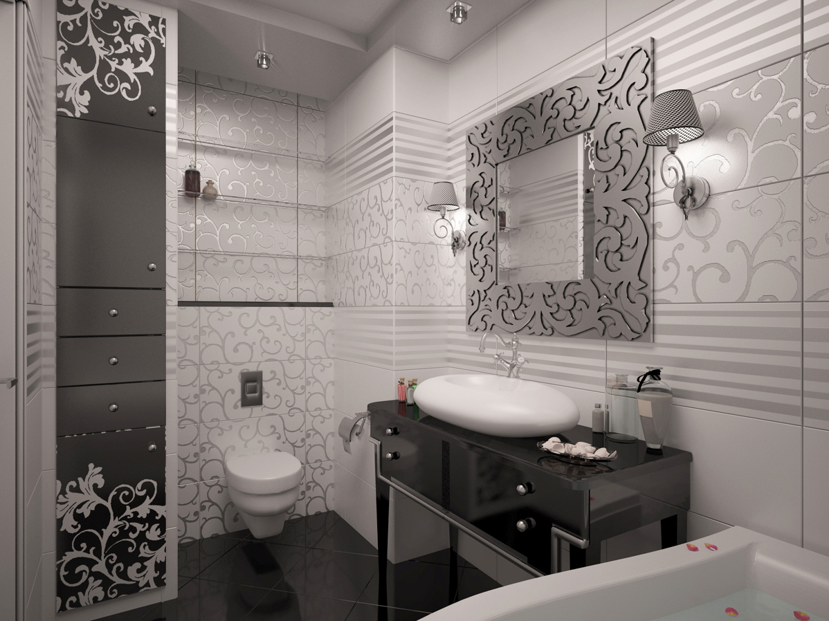 - Art Deco in the bathroom is designed to delight. Large tanks of an original form and non-standard approaches to lighting are appropriate, utilitarian objects are hidden behind doors in niches and cabinets.