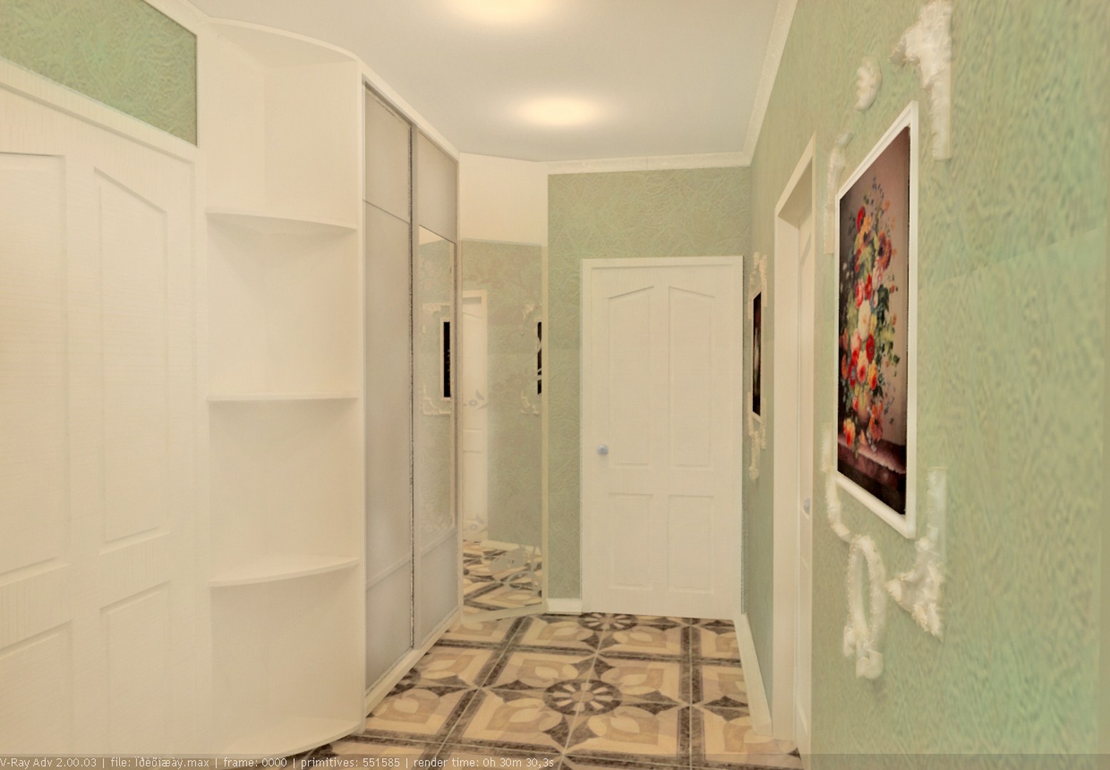 Room interior with white doors.