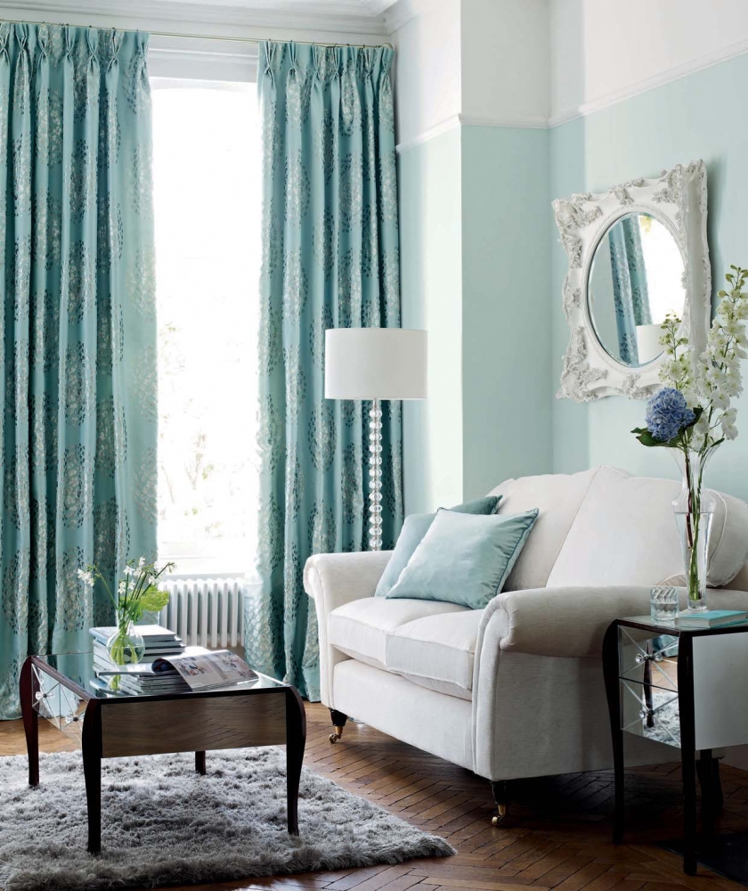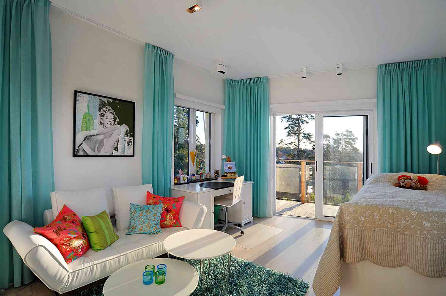 Curtains or sofa cushions look aquamarine. Also be sure to appreciate the vibrant combination of this color with purple.