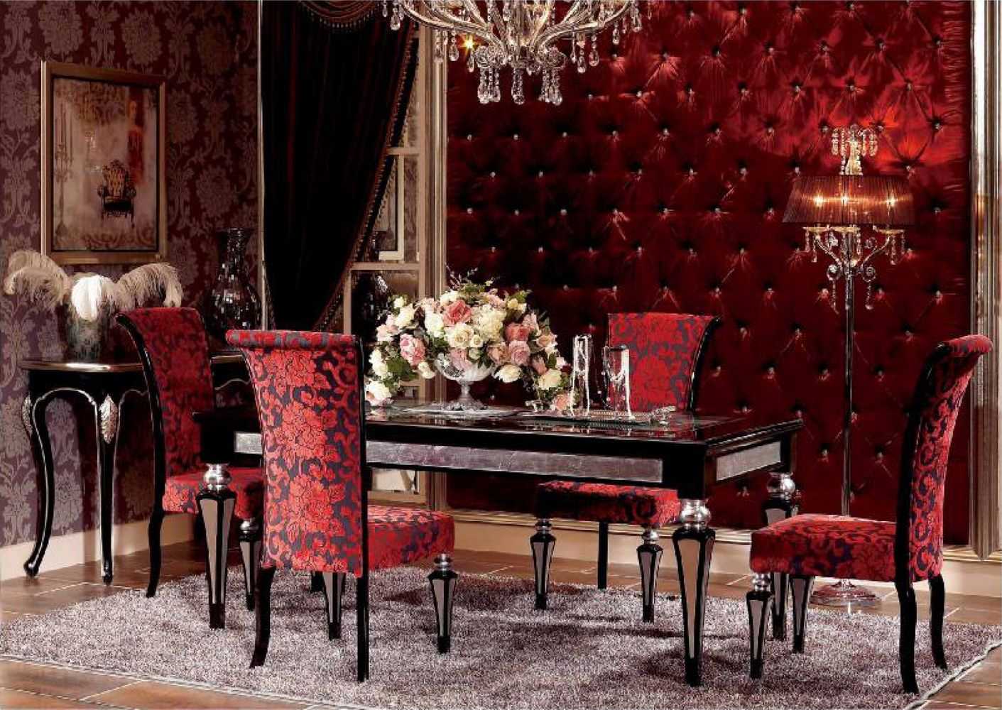 Looks great with burgundy upholstered chairs around a massive ebony table. This design makes an impression. You will often hear words of admiration from the guests.