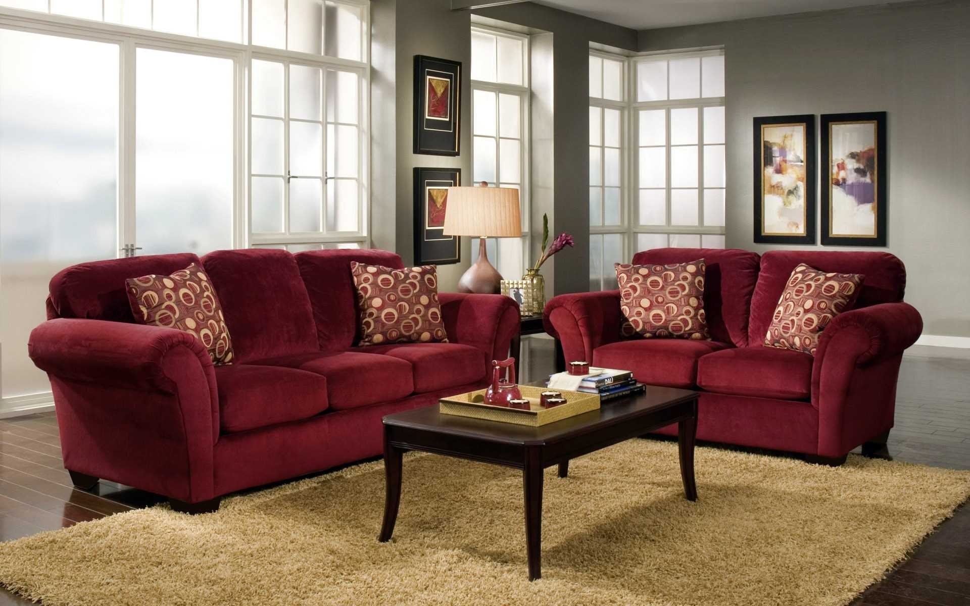- A shade of burgundy visually reduces space. Use it in spacious bright rooms. For example, a burgundy sofa looks great in the interior of a large living room.
