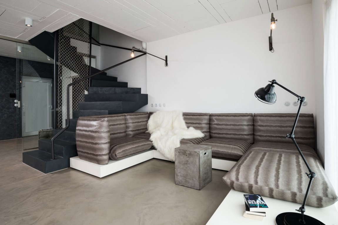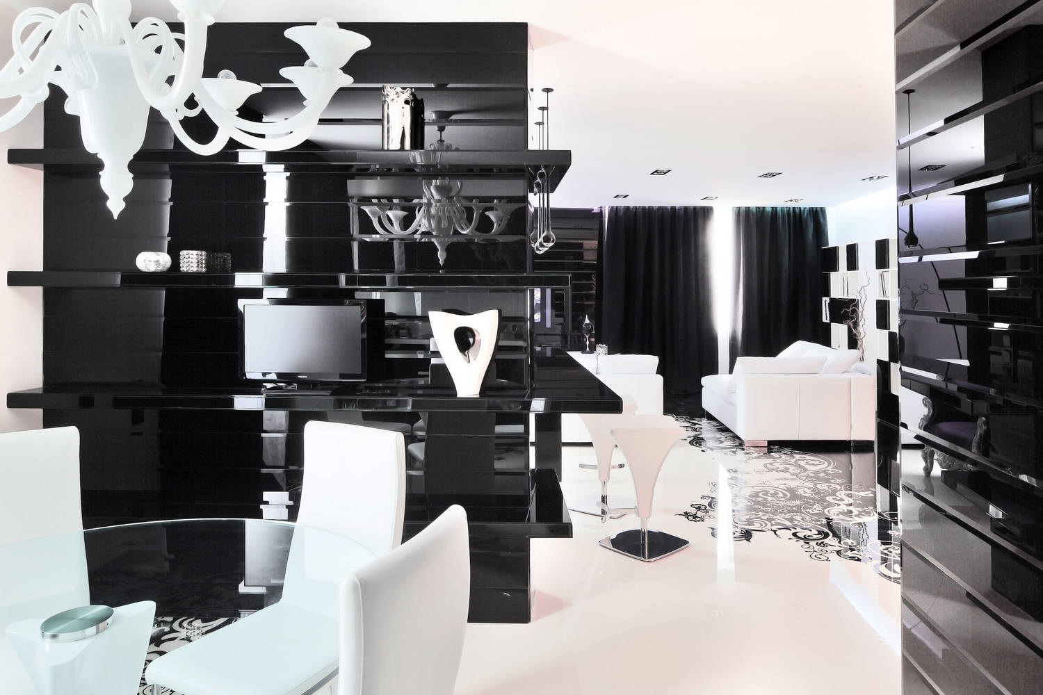 Most often, the floor in black and white apartment design is made black. This is not only practical, but also looks very impressive.