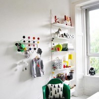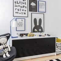 Instead of bulky designs, more familiar for us, chests of drawers with open shelves are used in this style. They place books, toys and souvenirs. Little things are stored in wicker baskets made of natural straw, chests or colorful wall panels with plenty of pockets.