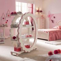The interior and decor of the children's room for two girls should reflect their hobbies. If their hobbies are more mundane, for example, children's shopping for young women of fashion, an improvised fitting room can be distinguished. For those who like to show off with a microphone, equip a small stage in a free corner. For fans of Barbie dolls on one of the walls, arrange an exposition with shallow shelves that will not take up much space.