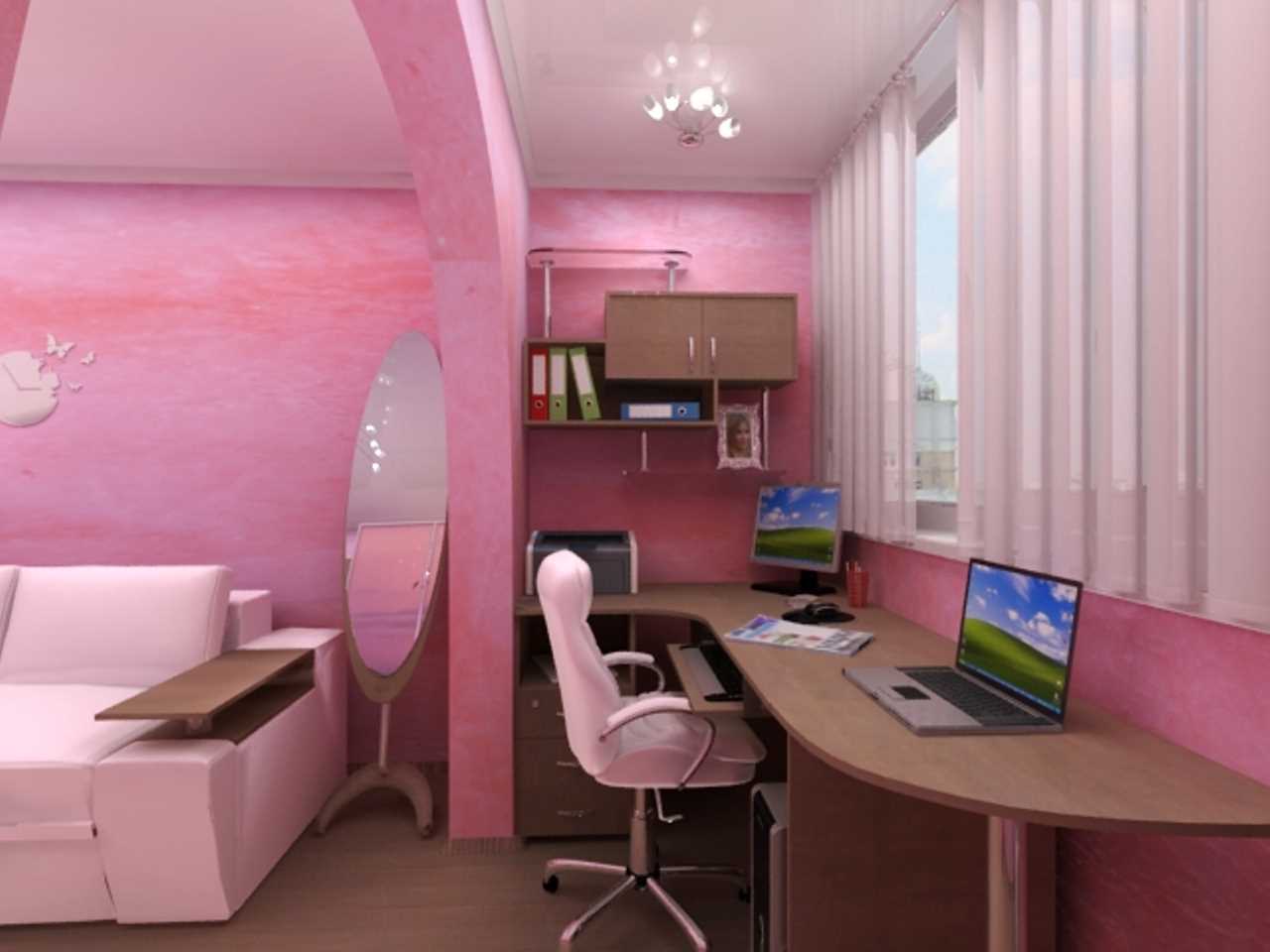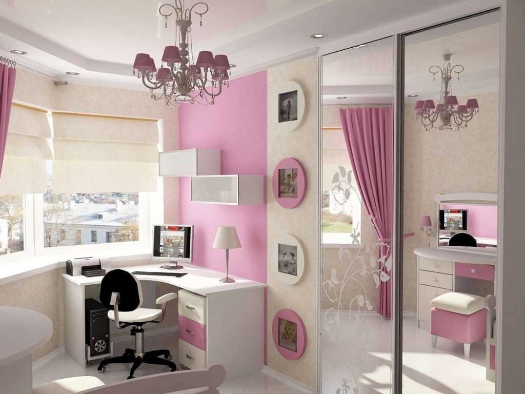 A workplace is an important area in a teenager’s room. It must be properly equipped. A convenient table is set so that the girl feels comfortable while doing homework. Necessarily good coverage of the area. Therefore, it is placed next to the window. When it is not possible to provide the natural, a lamp is placed on the desktop.