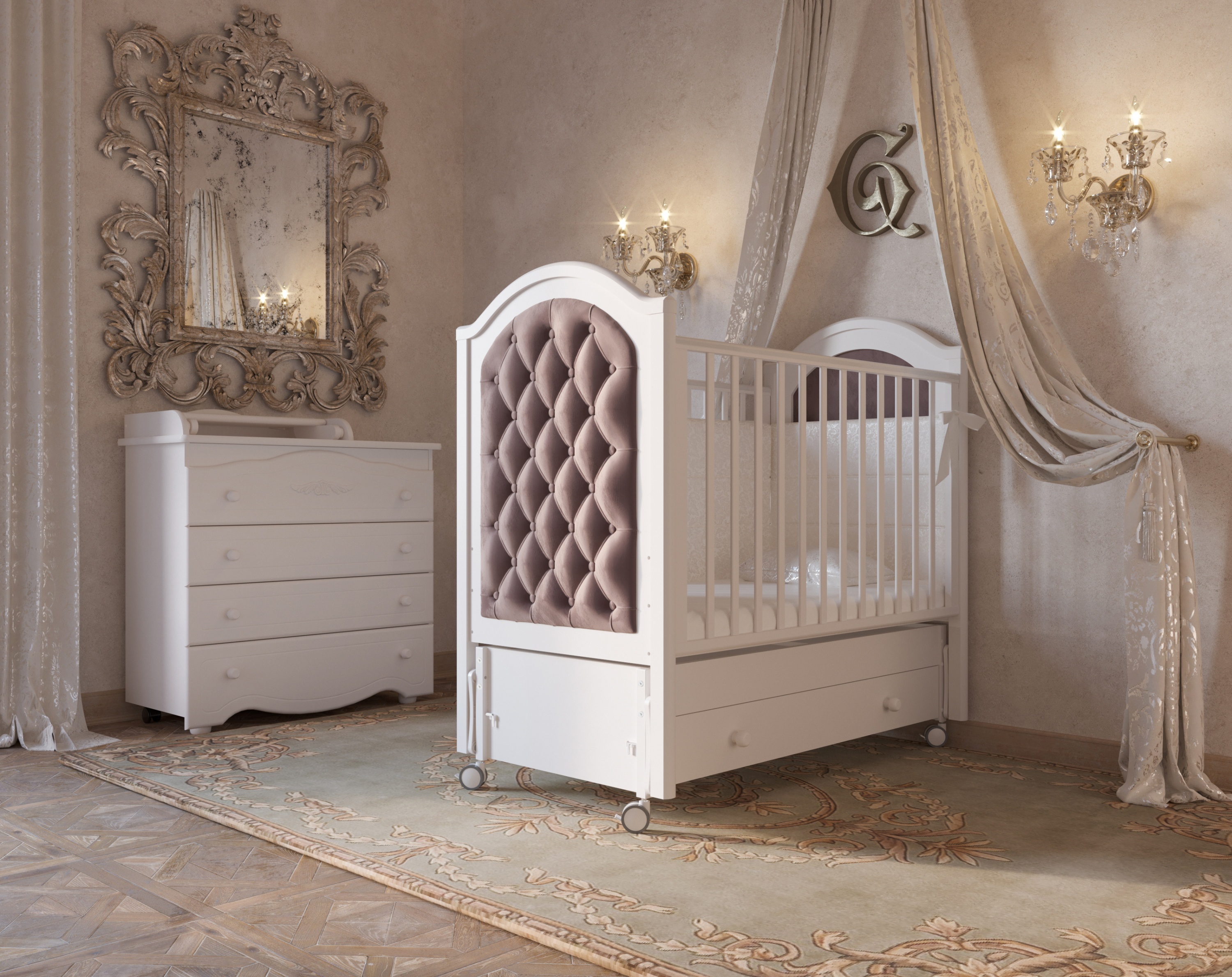 The design of the children's room for a newborn boy differs significantly from the lushly decorated girl's room.