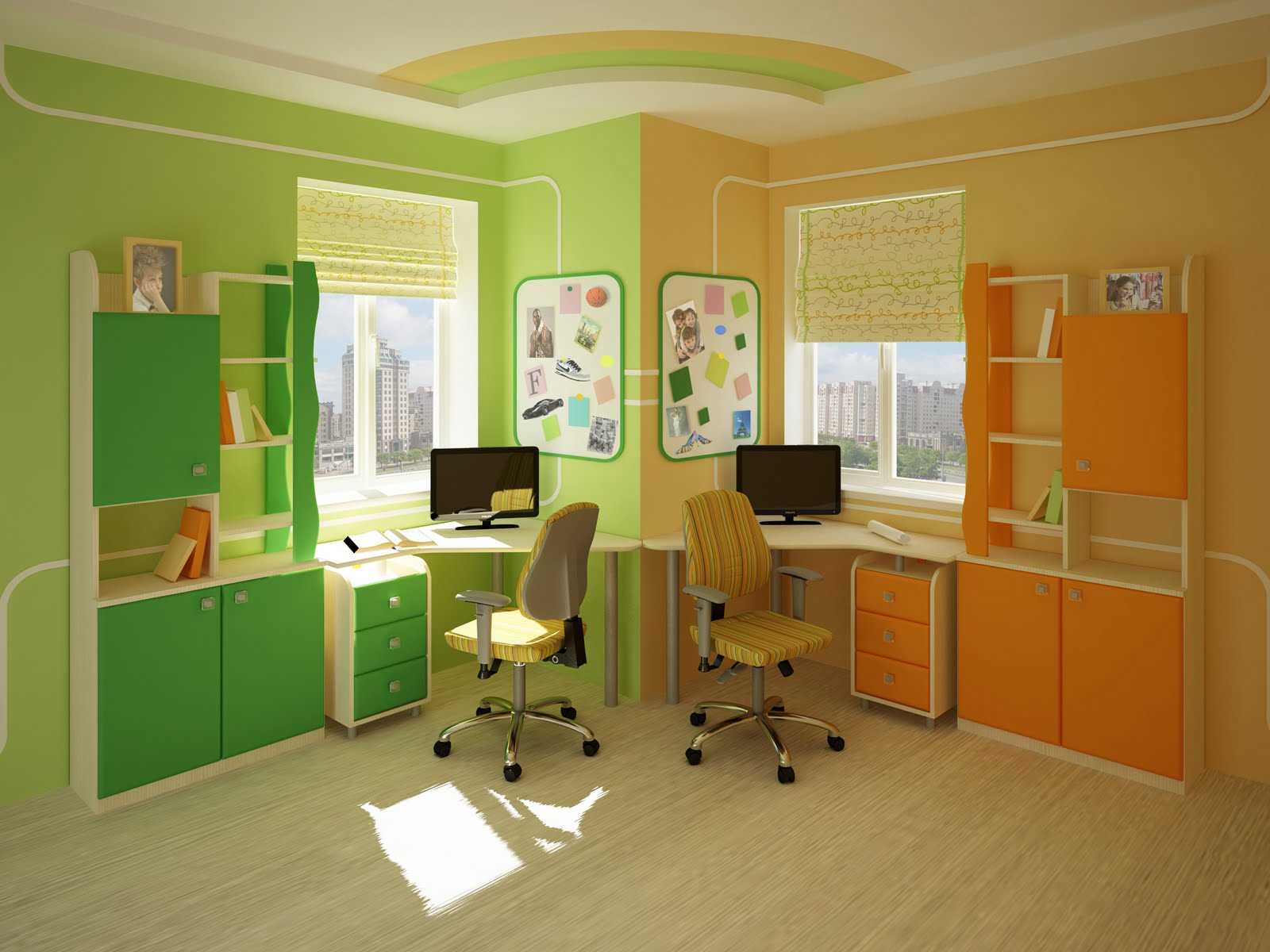 Students need a comfortable desk or computer desk. Each part of the table is separated for each child, and its personal area is equipped with shelves and drawers at arm's length. Necessarily good (but not very bright), local lighting where children learn lessons or sit at a computer. The room for two children and its design is important to update by periods: