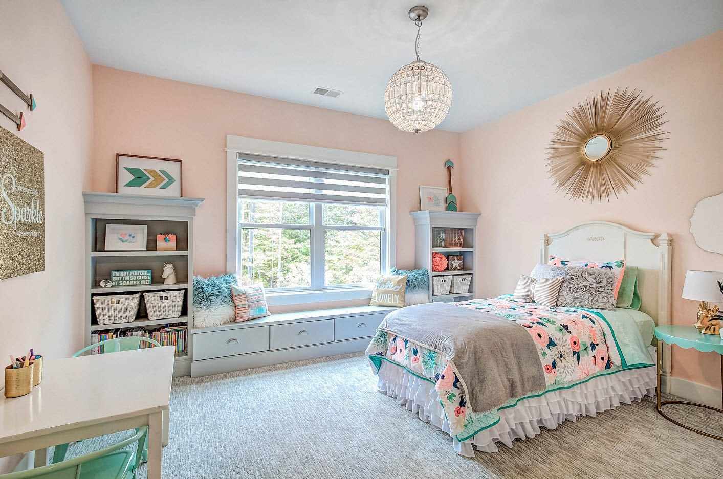 The pink room is a classic and a bit boring solution for a girl’s bedroom. Associations with a Barbie doll may seem too childish for a girl of 10-12 years old, so you should be careful when choosing a shade of pink.