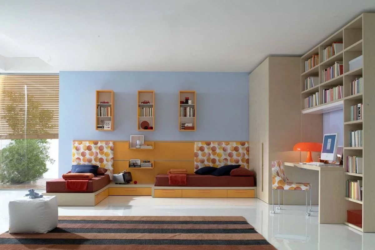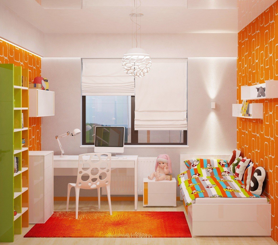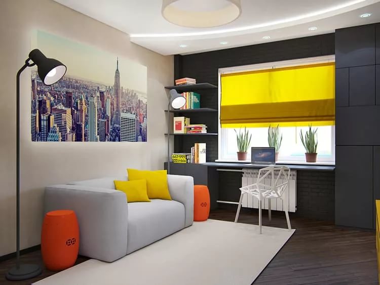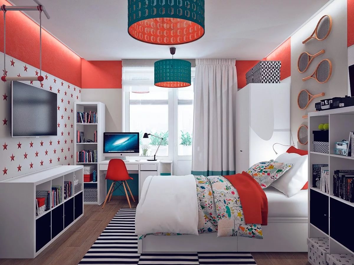 It has long been recognized that warm colors in a room are conducive to communication and activity. Cold - blue, green, inhibit nervous activity, contribute to relaxation, falling asleep. White, black and gray occupy an intermediate position.When choosing a design for a children's room for a boy or teenager 2019, this combination is at the peak of popularity. The interior in red and orange shades will prompt the inactive child to communicate, play, and intellectual activity.