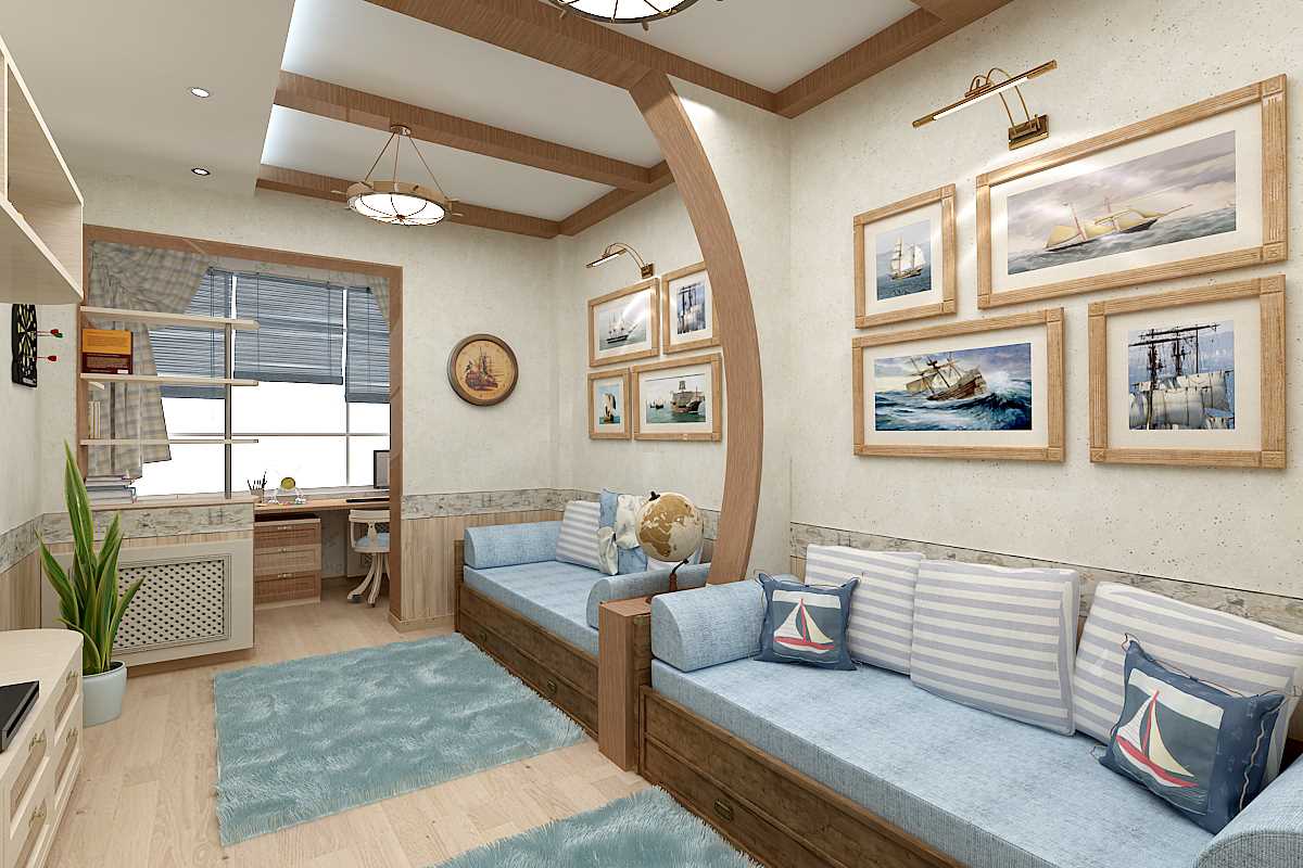 Additional Information! To create an atmosphere, it is convenient to use accessories in the form of anchors, paintings with ships and lighthouses. Accents of metallic shades on the walls of the nursery are possible.