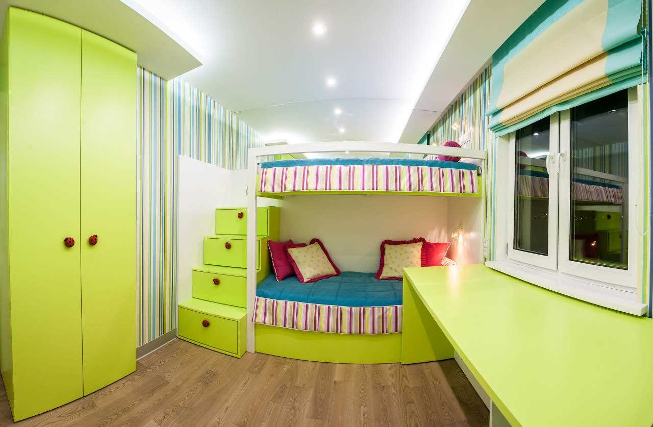 A more advanced option is to build a podium. The bedroom can be located both on the podium and below. The installation of such structures is often combined with the construction of a game complex, including a slide, a ladder, a rope, gymnastic rings.