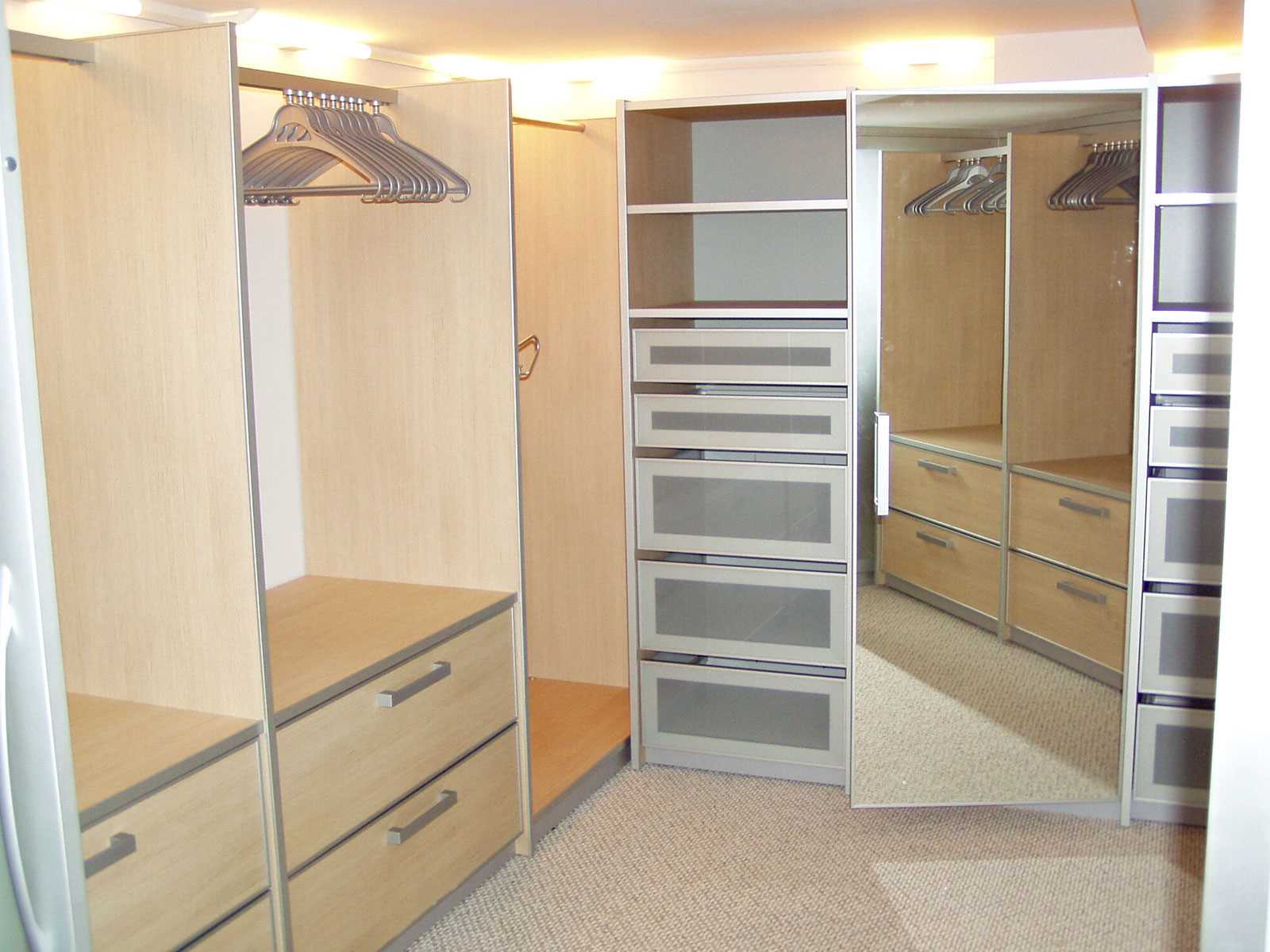 Attention! Built-in furniture, shelving, open partitions and shelves or collapsible modules - the choice depends on the taste of the owners and the design of the preferred options for the wardrobe room. Mandatory attribute - full-length mirror, regardless of design.
