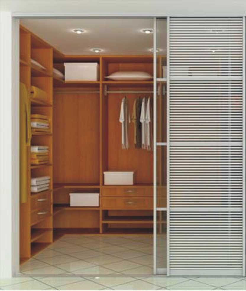 - The design of a corner dressing room is most often tied to the decision of a room where there is an empty corner (usually a bedroom). The wall from the gypsum wallboard under the wallpaper, frosted glass or laminated plywood will help to fence off. Conveniently 2 doors on the sides, the interior of such a dressing room is not as important as the exterior design. The main thing is the most thought-out storage system for things behind a false wall.