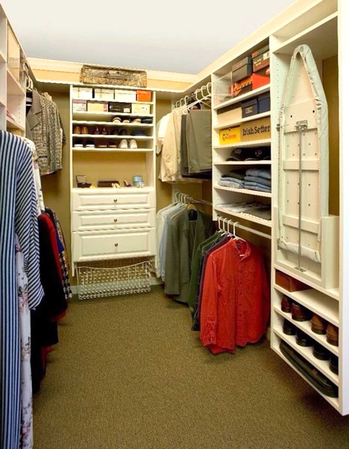 The main difference between the male system of placing things - here everything is strictly ordered and systematized. Business suits hang separately from light outerwear of a sporty cut, white shirts separately from color ones. As a rule, each suit has its own trempel, so that there are no random creases if one shoulder of the jacket falls under other clothes.