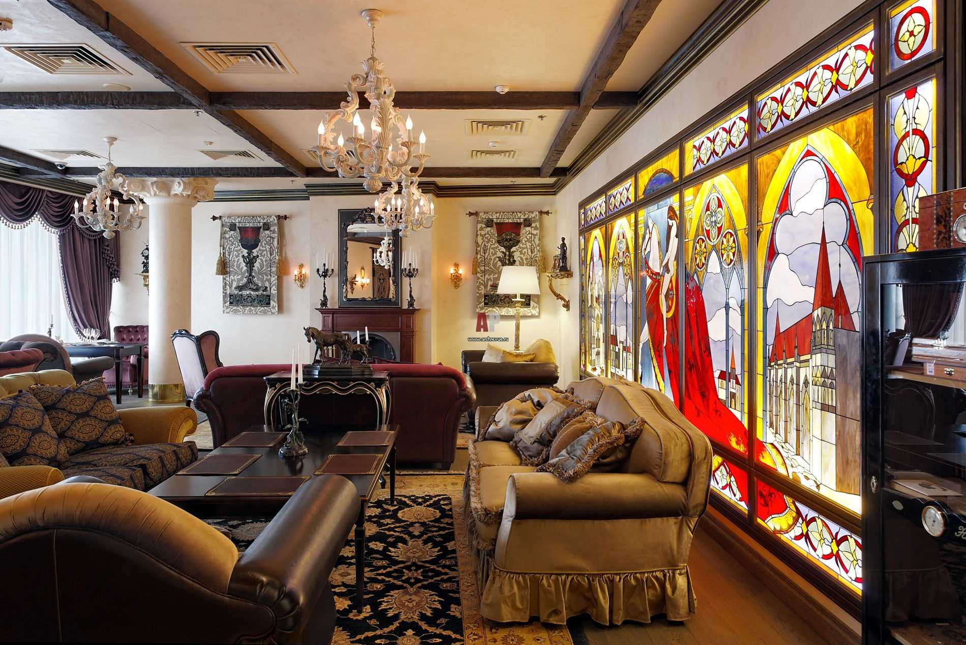 - If the windows are decorated with stained-glass windows - curtains are not needed. However, it is possible to decorate interior doors, furniture facades with stained-glass windows, then decorate the windows with dense heavy curtains on forged or massive wooden cornices.