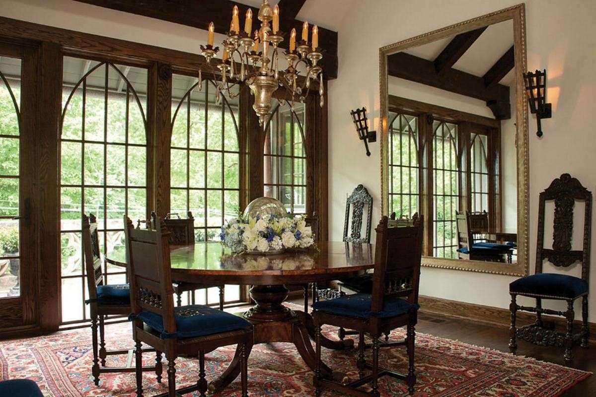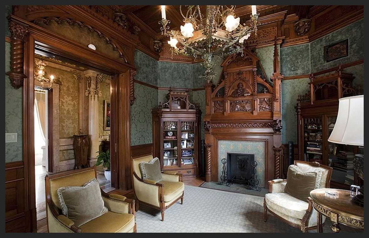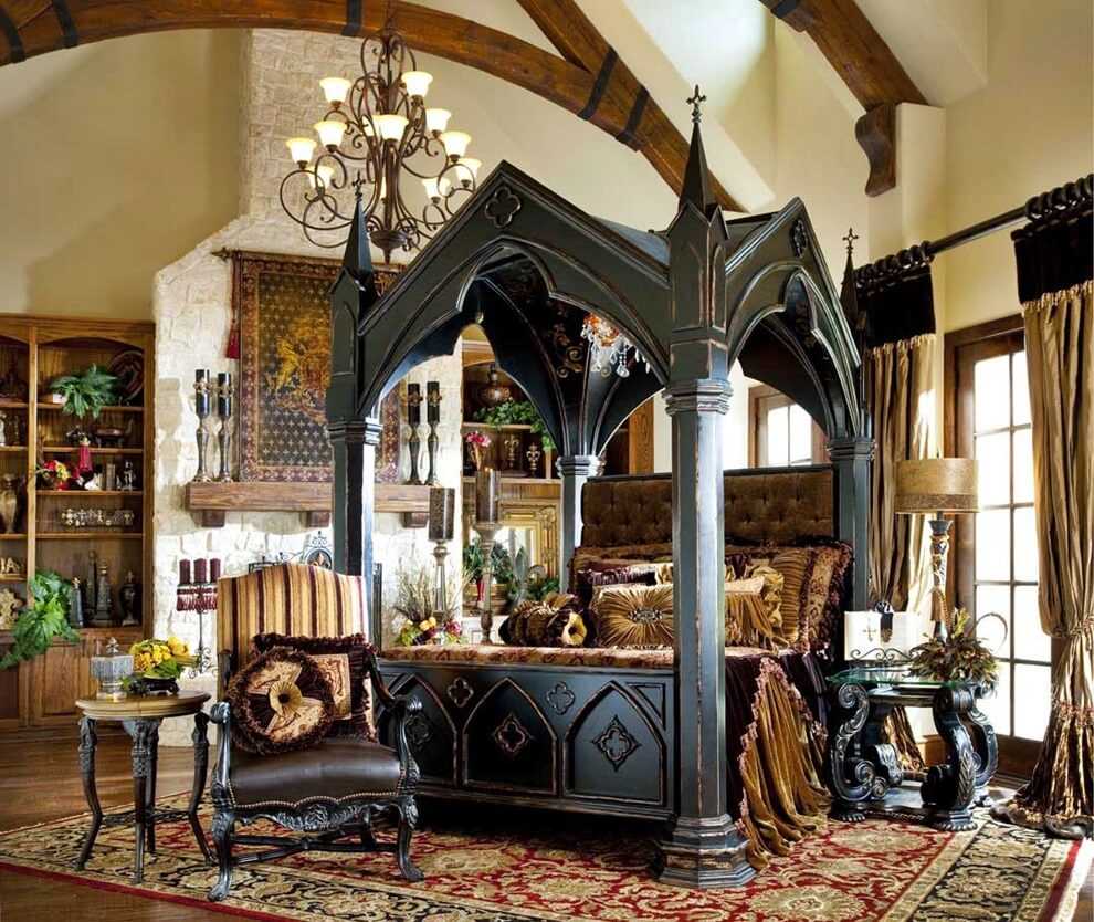 In the living room, chairs reminiscent of the royal throne with high backs and armrests, round tables with carved legs are appropriate. They will be complemented by marble countertops, mirrors framed by a massive frame. A mandatory element of the living room is a fireplace with a metal grill in a wooden frame. Ideally, if it is decorated with Gothic ornaments, Celtic symbols. The fireplace can be decorated with natural stone, marble, for example.