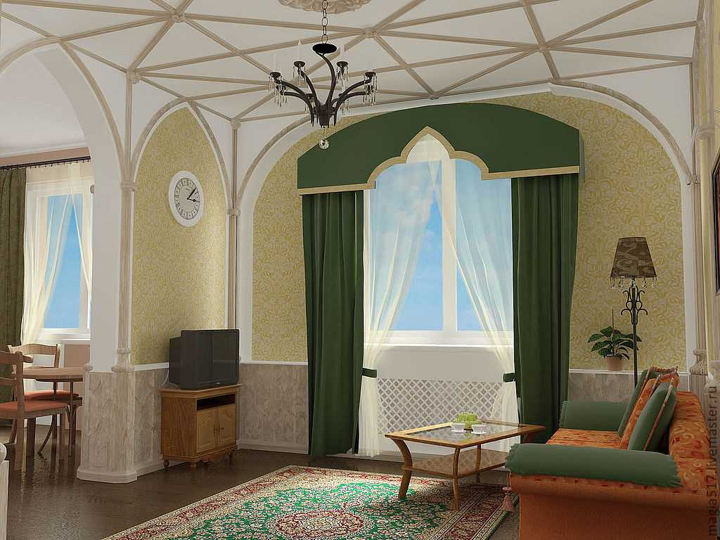 Without a light background, the room would have looked gloomy, dull. It is especially brightly played by multi-colored stained-glass windows in which a variety of colors can be used: red, brown, yellow, blue.