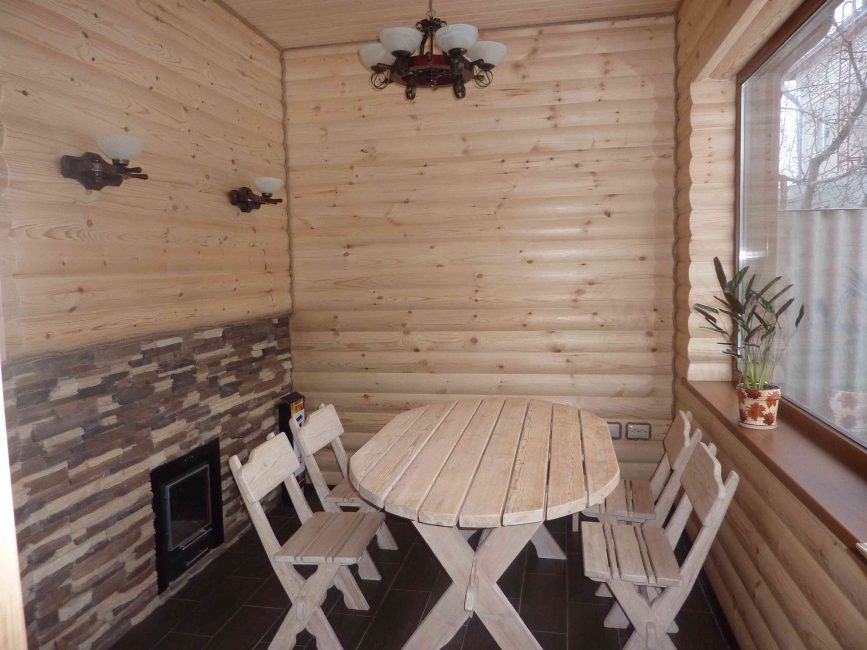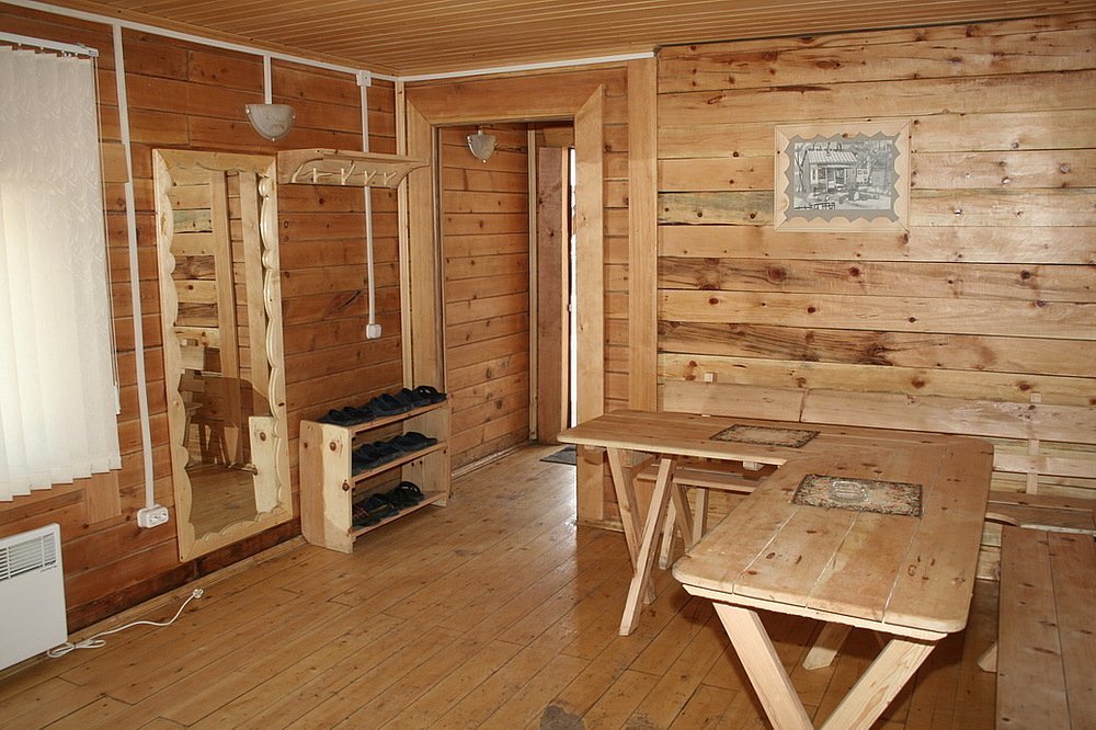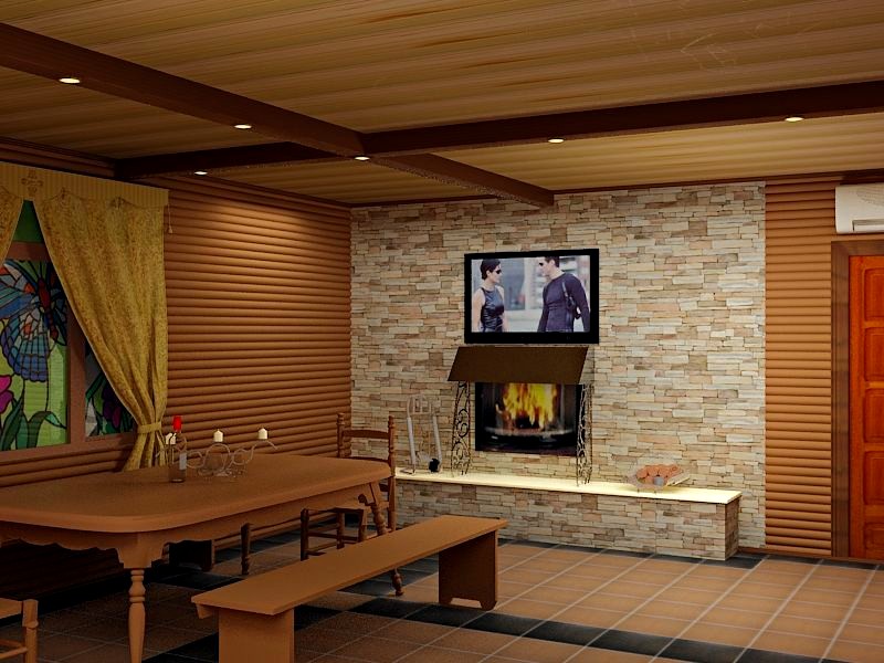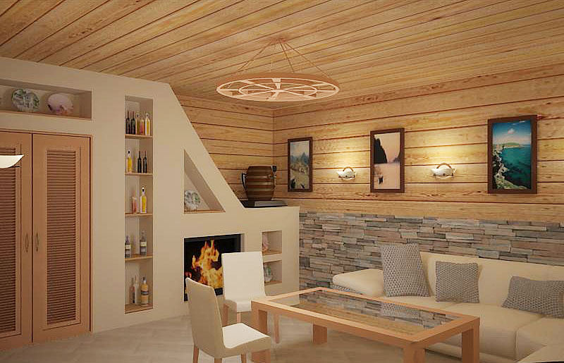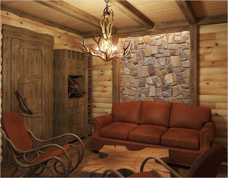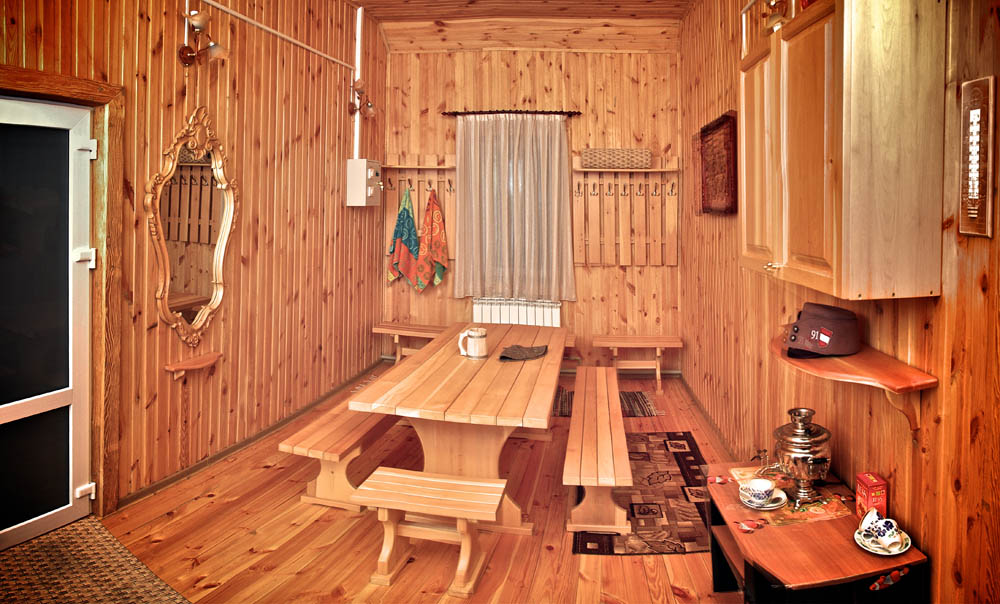 Lounge - the place is warm, but not hot. Coniferous wood for decoration and furniture is quite suitable here.