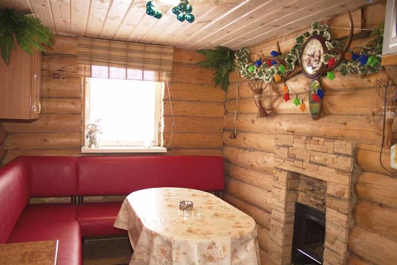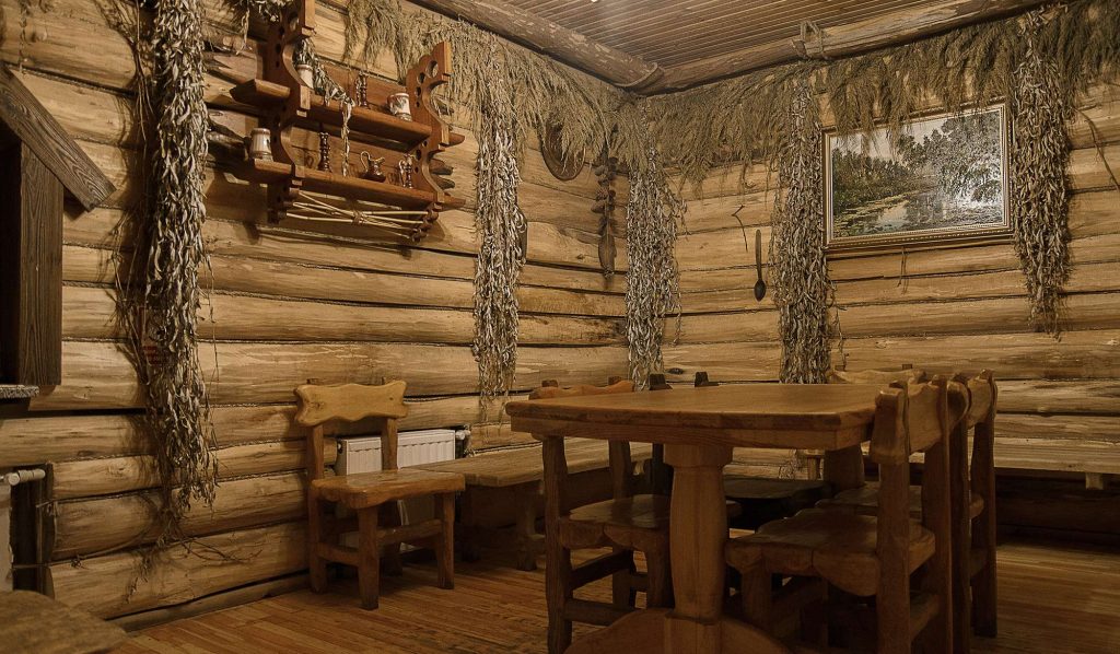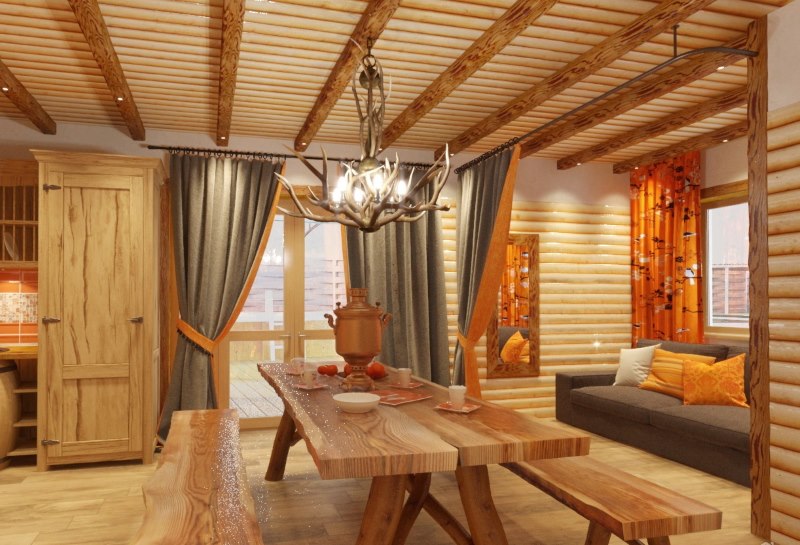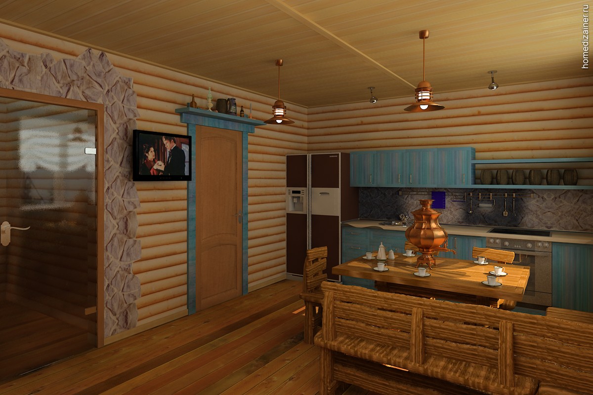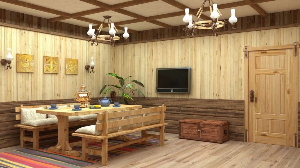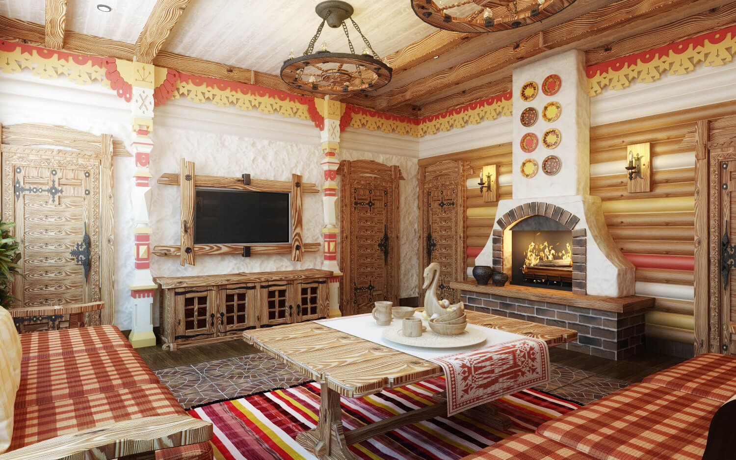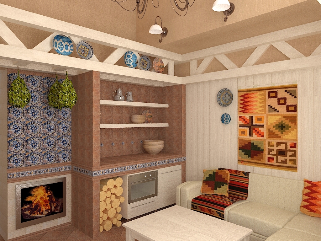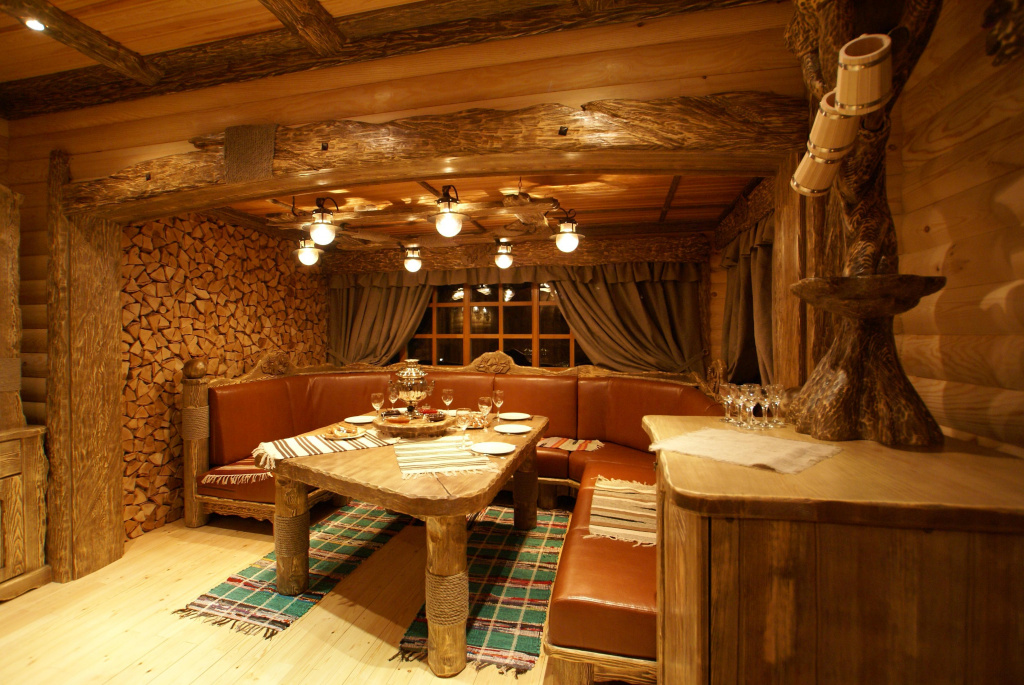 The most common design. The main feature of the style is the maximum use of wooden elements. Walls, floor, table and benches, utensils - all this should be made of wood of natural color. When decorating, tablecloths, curtains or towels with embroidery, bath brooms, bunches of dried herbs are used. Hang a pair of bast shoes on the wall, and put a Tula samovar with a bunch of bagels on the table and the Russian style is ready.