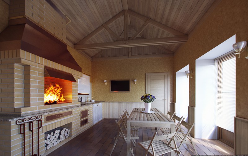 Most often used in large, spacious rooms for recreation, built of brick, cinder block. It is planned to install arches, columns, stucco moldings in a classic style. The furniture has simple and concise shapes.
