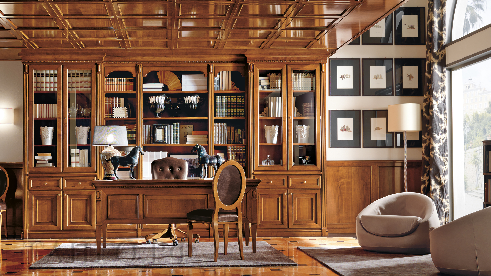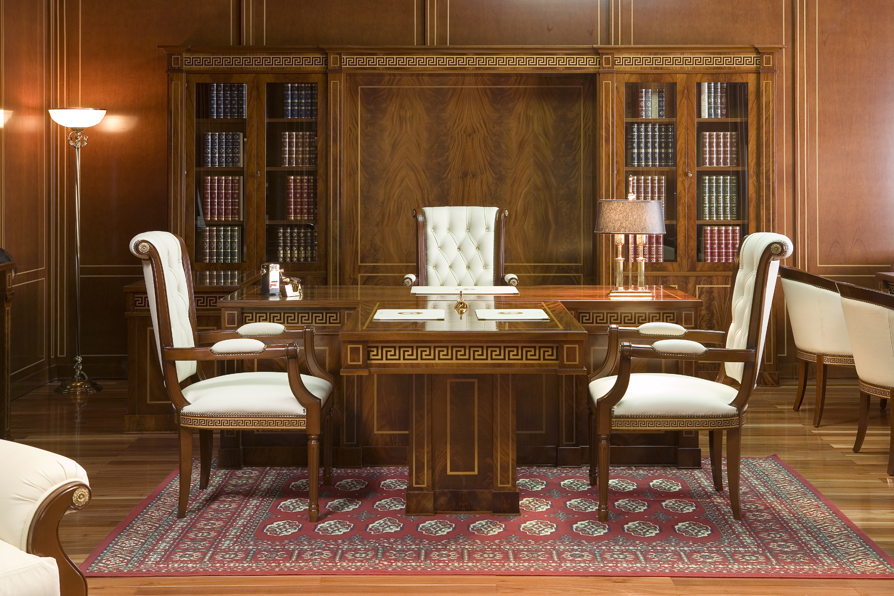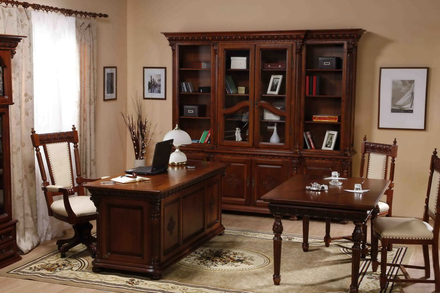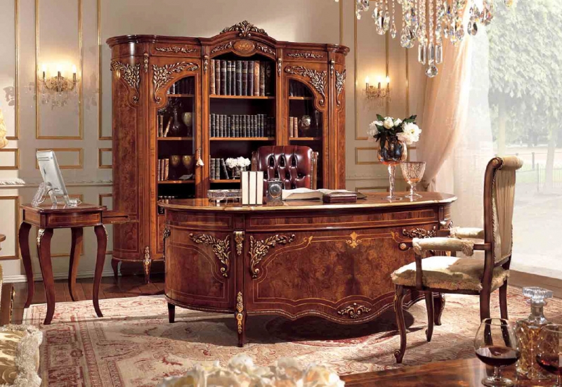 The classical style provides for massive wooden furniture, original accessories with gilding elements, leather upholstery of upholstered furniture, and manual work.