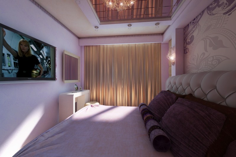 The conjugal bedroom can be decorated in the spirit of romanticism. The choice of color depends on personal preferences, but a light lilac or pale blue color usually suits both spouses. The choice of the benefit of modern style is emphasized by the soaring ceilings of bulk floors.