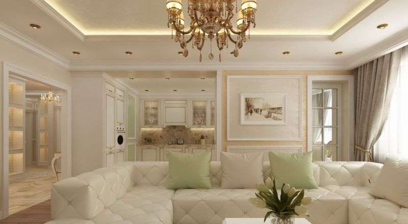 For classics, light pastel colors are characteristic, which can be seen in abundance in the walls, ceiling, furniture.