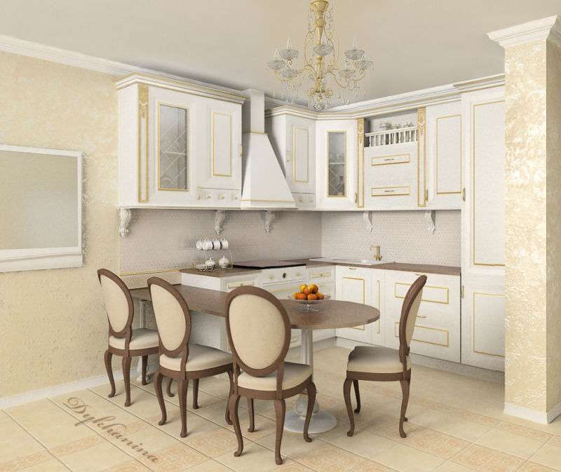 If a classic design is chosen to design an apartment, then you must adhere to certain of its rules. The main one is a competent combination of luxury and practicality. As a rule, there is not as much space in the apartment as we would like, but it is worth remembering that in a classic-style kitchen, dinners should not be held. For these purposes, a neighboring room is used - a dining room. In the apartment, a similar effect can be achieved by combining the kitchen and the living room.