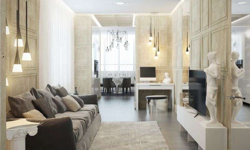 The modern classical style can be used not only in three-room apartments, where it is not difficult to translate the features of the direction. We are talking about massive expensive furniture, a fireplace and columns. Today, the classic applies even to a small area. In this case, the technique will be as hidden and invisible as possible.